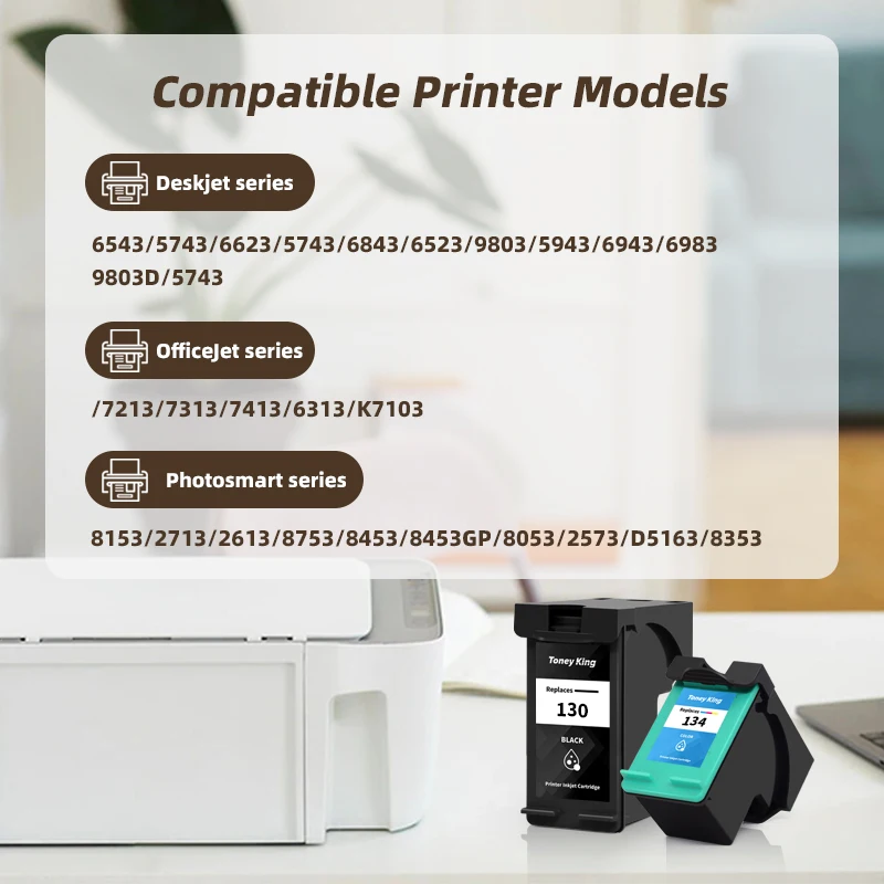 Marca: Toney KingNúmero de cartucho: Compatible con el cartucho de tinta HP 130/134Color: Negro, tricolor (C/M/Y)Estado del cartucho de tinta: tinta completaVolumen de tinta: 2, 1, 2, 2, 1, 2Rendimiento de página: Bk 890 páginas, 500 páginas tricolor (en formato A4, cobertura 5%)El paquete incluyeElige negro 1:1Elige 2 : 1 tricolorElija 3 : 2 negroElija 4 : 1 negro + 1 tricolorElija 5 : 2 negros + 1 tricolorElige 6 : 2 negros + 2 tricoloresCompatible con impresora (solo como referencia):Para HP Deskjet 6543 5743 6623 5743 6843 6523 9803 5943 6943 6983 9803D 5743Para HP Photosmart 8153 2713 2613 8753 8453 8453GP 8053 2573 D5163Para HP Officejet 7213 7313 7413 6313 K7103Para HP Photosmart Pro 8353 PRO B8353Aviso:Confirme que el modelo de cartucho de tinta original de su impresora es para HP 130 134 (o 130/134XL).Si es para HP 130 134 (o 130/134XL), nuestro cartucho de tinta será compatible con su impresora.Si su antiguo cartucho de tinta no es 130 134 o 130/134XL, no lo compre.