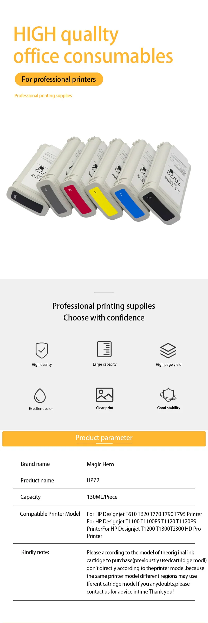 6 Color 130ml for HP 72 Compatible Ink Cartridges with Chip For HP72 Designjet T610 T770 T795 T1100 T1120 T1200 T1300 T2300 Printer
