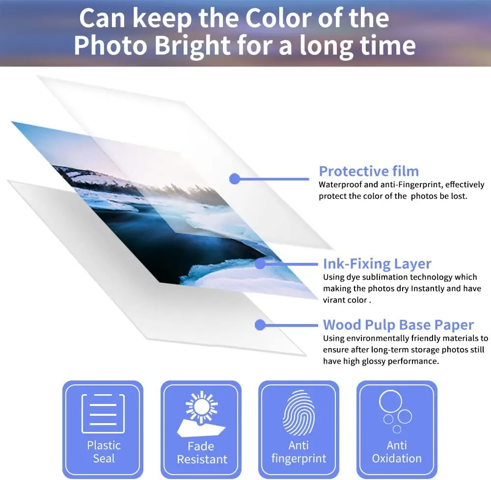 Tecnología de sublimaciónSecado instantáneo, sin manchas, resistente al agua, antihuellas y antioxidante. La foto se cubrirá automáticamente con una película protectora después de la impresión, para que pueda guardarla durante mucho tiempo. Puede imprimir fotos coloridas y de alto brillo, lo mejor para que guardes tus buenos recuerdos.