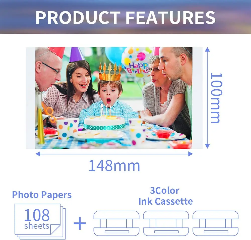 Paquete incluido:Paquete de 3 cartuchos de tinta de color compatibles con Canon KP108 y 108 hojas de papel fotográfico son del tamaño de una postal (4x6 ",100x148mm), tinta de color suficiente para 108 impresiones.
