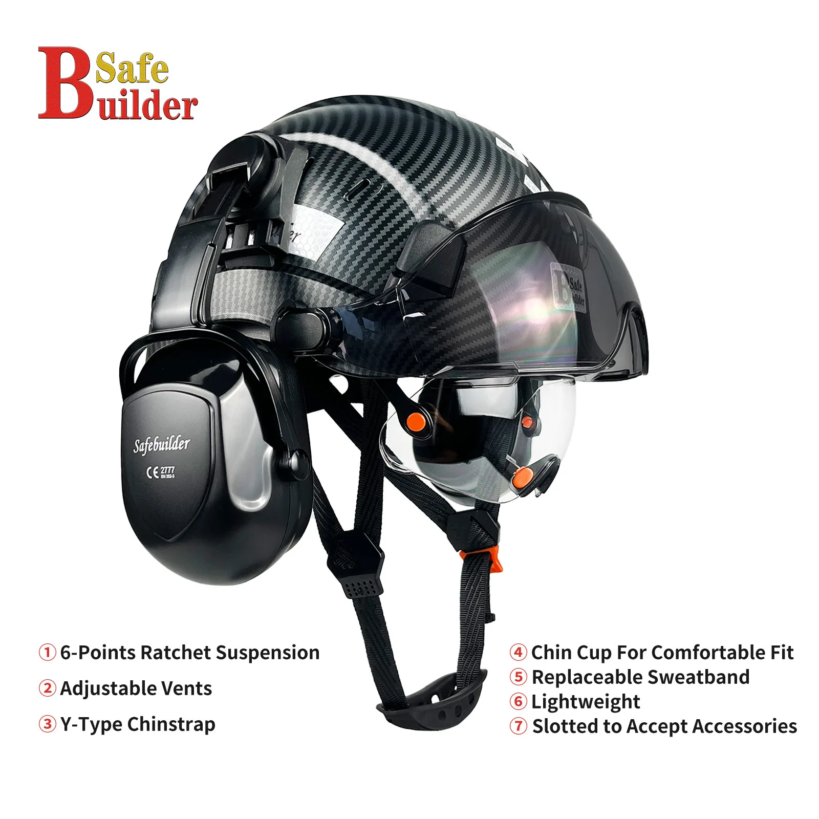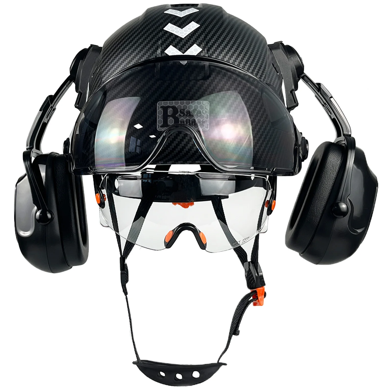 Casco de seguridad con patrón de fibra de carbono CE, con visera integrada, orejeras y pegatinas reflectantes para ingeniero, casco duro de construcción ABS