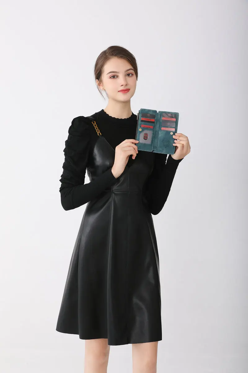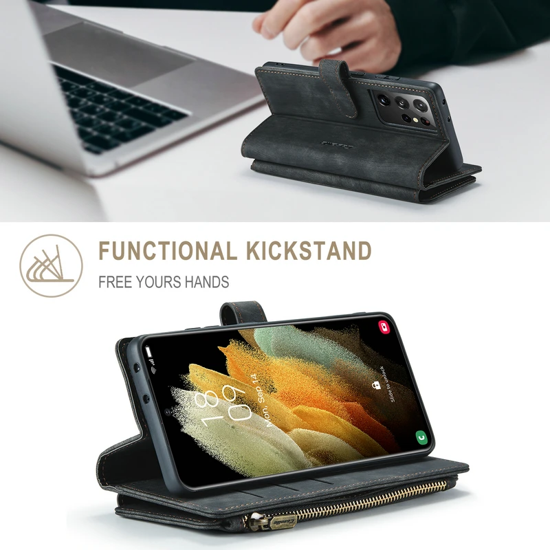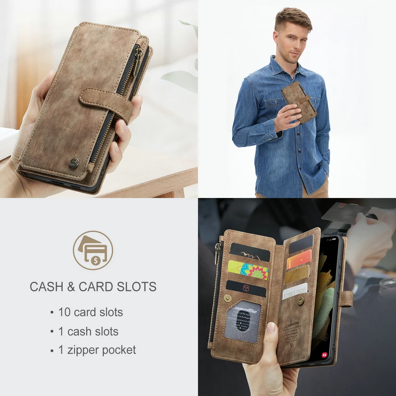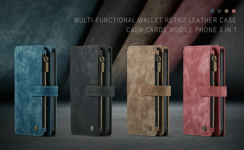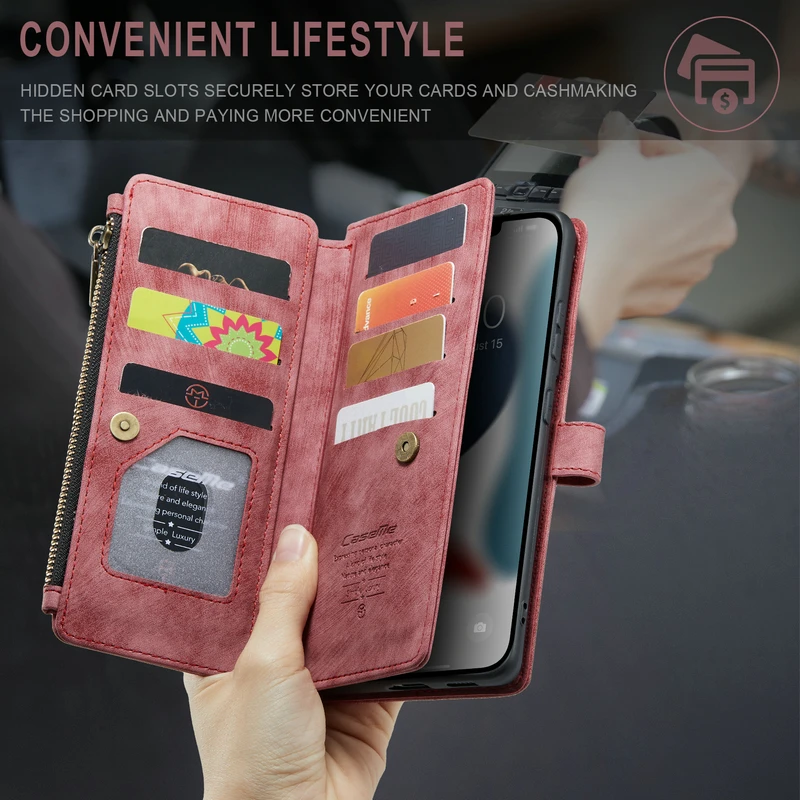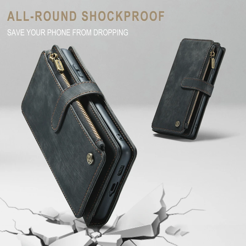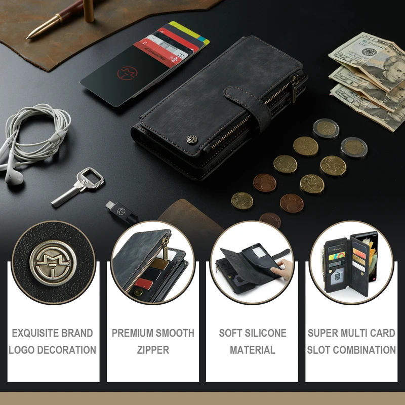 Funda cartera con 10 ranuras para tarjetas + cartera con cremallera + funda trasera.
