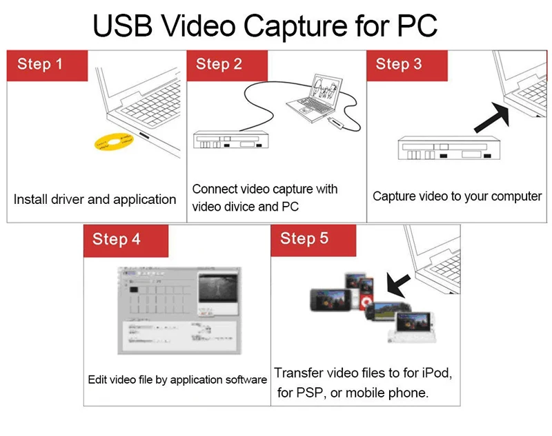 Conéctese al puerto USB del ordenador, capture vídeo en formato digital de alta calidad desde una fuente de vídeo analógica, como una videocámara antigua, VHS, cámara por software de vídeo, guarde en su PC o grabe un disco DVD.