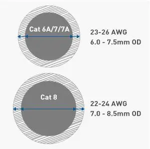 Admite cable Cat8 AWG blindado de 22 a 24 AWG con un diámetro exterior entre 7,0 y 8,5mm; Compatible con versiones anteriores como conector Cat 6A o Cat 7