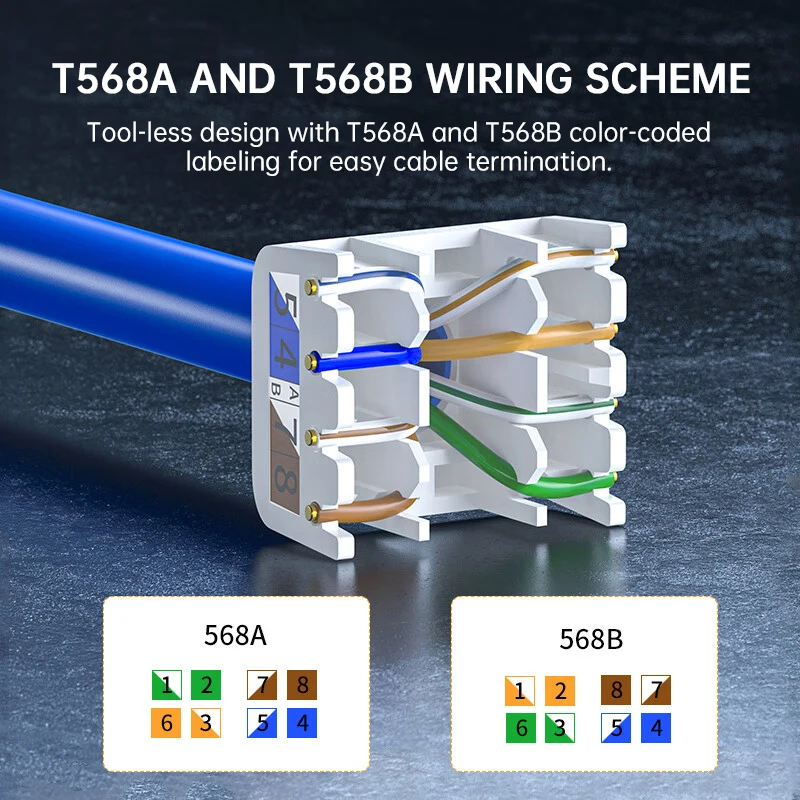 Diseño sin herramientas con codificación de colores T568A y T568B para una fácil terminación del cable.
