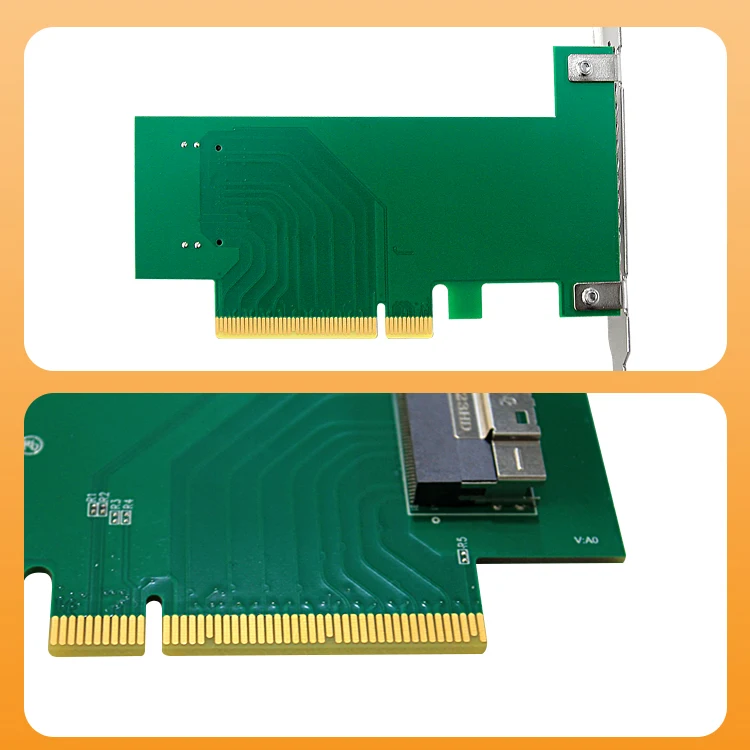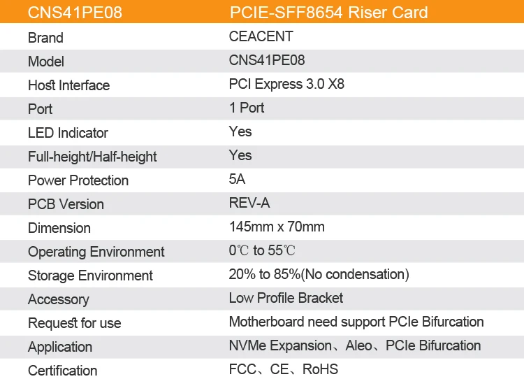 CNS41PE08 requiere que la placa base admita la bifurcación PCIe. A Través De CNS41CX16I o CNS41CX16W (tarjeta adaptadora SFF8654 a PCI-E x16), puede extender PCI-E x8 a PCI-E x16. Esta tarjeta adaptadora también se puede aplicar a ALEO, que se utiliza para aumentar la ranura PCIe x8 a la ranura PCIe x16 para extender la GPU. Este diseño de tarjeta adaptadora de disco duro se utiliza principalmente para la expansión de soluciones de servidor y los cuellos de botella en el almacenamiento de computadoras de escritorio de alta gama.