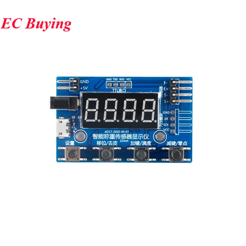 Key Function:Setting—Parameter setting key. In the setting state, it is used to store the new setting value of the parameter and enter the next setting parameter.Shift—When in the setting state, press this key to set the corresponding value. In working state, press this key for 3 seconds to peel.Add key—The set value increase key is used to increase the value in the setting state. In working state, press and hold for 3 seconds to calibrate fullness.Decrease key—The set value decrease key is used to decrease the value in the setting state. In the working state, press and hold for 3 seconds to calibrate the zero point.Parameter setting:dot Decimal point position, the range is 0 ~ 3. For example, the sensor range is 0-20Kg, which can be set to 2. Default 1ad-h acquisition speed, range 1-100 times / second. Default 20ts Send data regularly, 0-10.0s, when set to 0, send when the weight changes, send as fast as 3 times per second. Default 0.5 secondsWhen the en-b calibration is set to ON, press 3 seconds to enter the calibration in the working state. When set to OFF, press for 10 seconds to enter the calibration in the working state. ON by defaultini Restore factory settings, default is OFF. When set to ON, the factory settings are restored. OFF by defaultCalibration instructions, peeling:For example, suppose our calibration is now 100kg sensor.Zero calibration: Press and hold the minus key for 3 seconds, the screen displays -PL-, and then release the minus key to enter the calibration state. Do not put weight on the scale. Enter 0 on the module and press OK. Display -End zero calibration is complete.Full-scale calibration: Press and hold the plus button for 3 seconds, the screen displays -PH-, and then release the minus button to enter the calibration state. It can be put on a weight of 20 ~ 100kg, how much kg is put. We enter the weight value on the module and press OK. Display -End full scale calibration is complete.Tare: Be sure to calibrate the zero point during the first calibration, not just press Tare, and let the meter display the zero point. Zero point calibration does not refer to true zero load. Zero point can be calibrated under the condition of tare weight, for example, the sensor range is 100kg, the tare weight is 3Kg (unknown tare weight can be 0Kg by default), and the standard 35Kg weight is available. When the zero point is calibrated, no 35Kg weight is added, and the calibration PL=0.0Kg or 3.0Kg; after adding a 35kg load, the calibration PH=35.0Kg or (38.0Kg) is sufficient.
