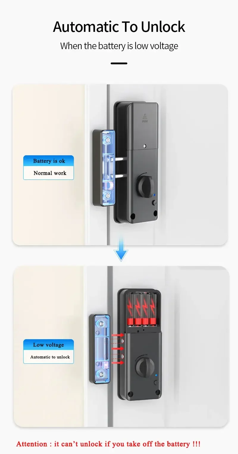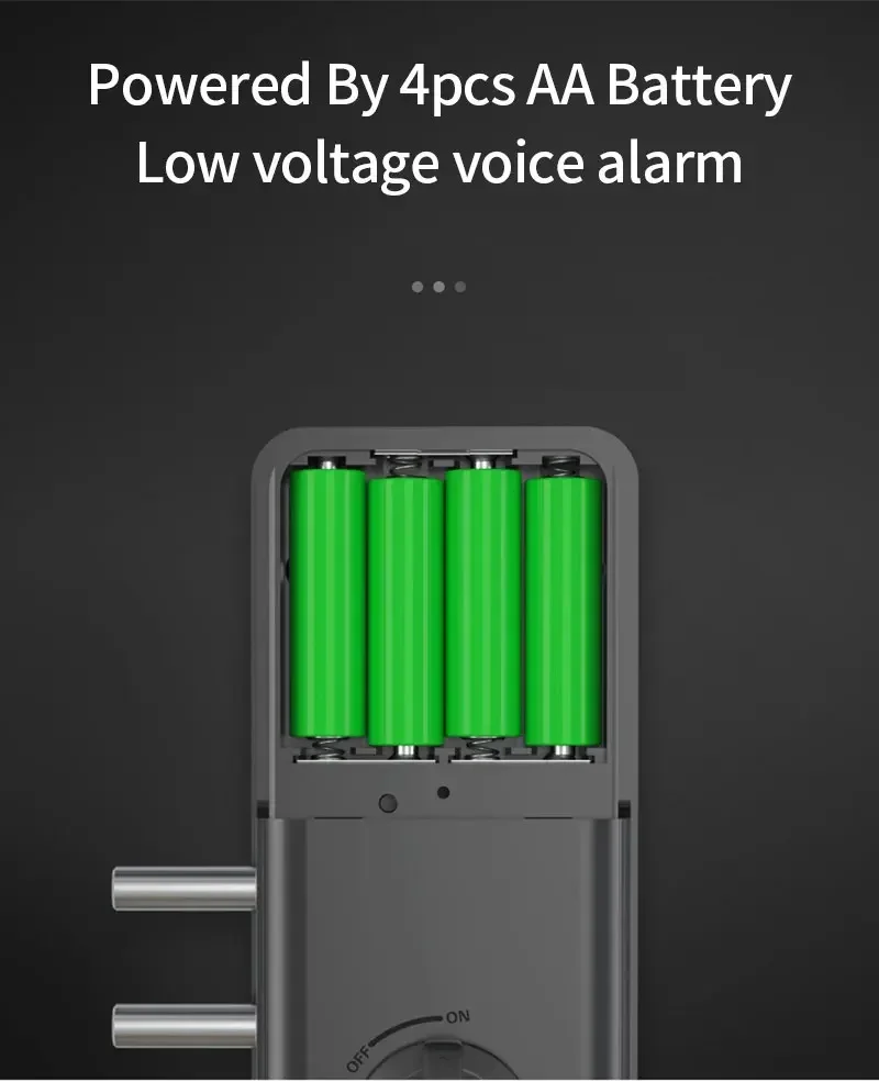 * Desbloqueo automático a baja potencia: cuando hay energía, la cerradura se desbloquea normalmente y el voltaje es inferior a 4,6 V para desbloquearse automáticamente.Cuando la potencia es baja, la lengüeta de bloqueo se retrae y desbloquea automáticamente.Cuando la energía es baja, el sistema de voz le recuerda que debe reemplazar la batería y ya no tendrá miedo de no poder abrir la puerta debido a la falta de energía.