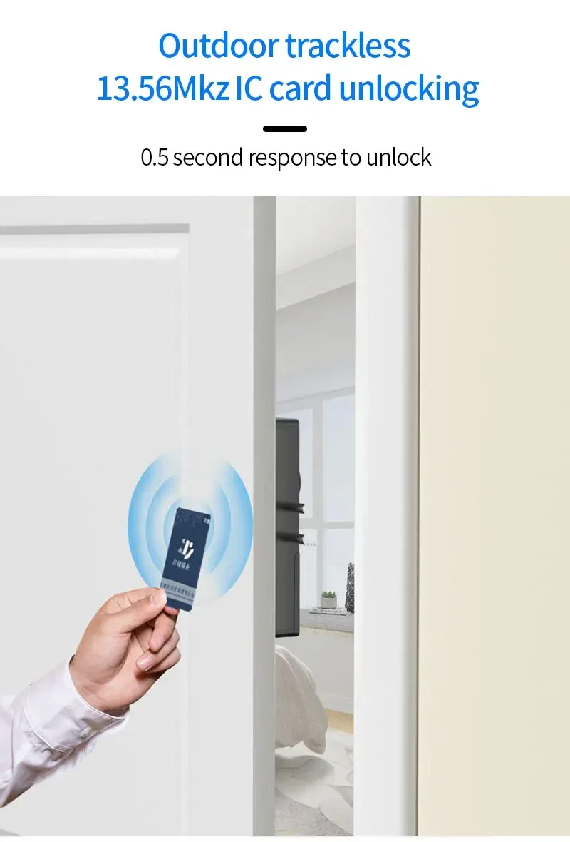 * Dos métodos de desbloqueo: la cerradura de puerta inteligente admite desbloqueo de aplicaciones y desbloqueo de tarjetas IC, desbloqueo de aplicaciones de teléfonos inteligentes y admite visualización en tiempo real de registros de desbloqueo.Puedes elegir la forma que quieras desbloquear.