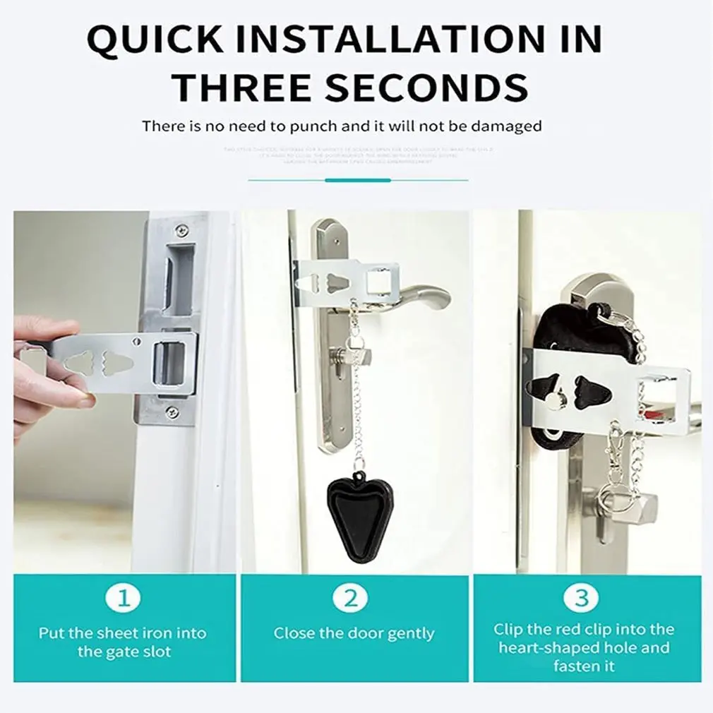 2. Fácil de usar: fácil de instalar o quitar, esta cerradura de puerta se puede instalar en segundos sin herramientas, incluso en situaciones de emergencia y en la oscuridad. Simplemente inserte la pieza de metal en la ranura de la cerradura de la puerta, cierre la puerta y luego coloque la ranura de la manija en el perno de la hoja de metal, entonces nadie puede abrir la puerta desde afuera.