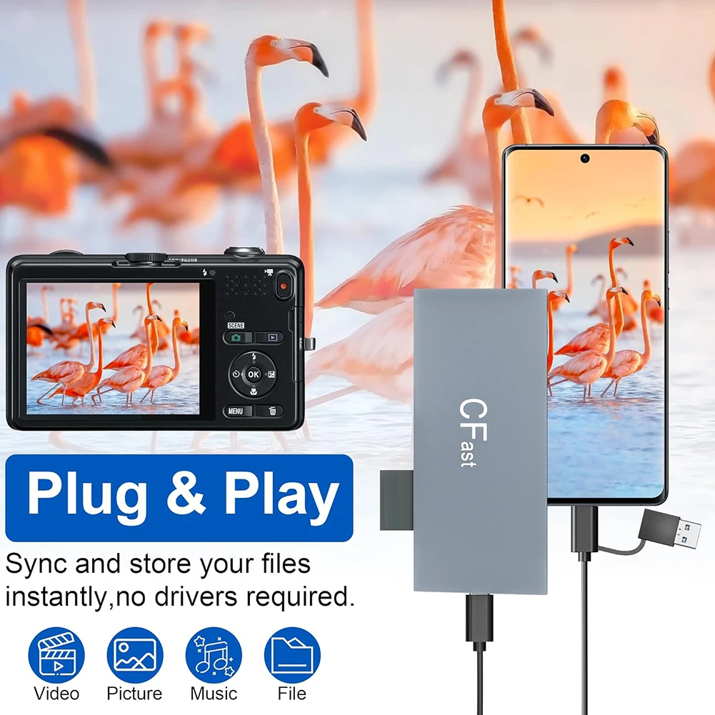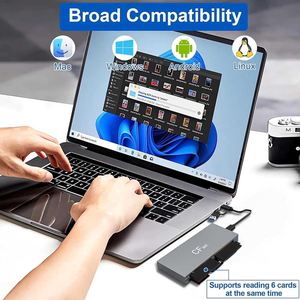 4. Amplio soporte de dispositivos:Nuestro lector de tarjetas USB C Cfast 2,0 admite una amplia gama de sistemas operativos, incluido Windows XP/Vista/7/8/8.1/10/11/Mac OS/Linux/Chrome OS. Ofrece funcionalidad Plug-and-play y capacidad de intercambio en caliente, por lo que es fácil de usar, no requiere alimentación externa, herramienta alimentada por USB para fotógrafos y videógrafos en movimiento.