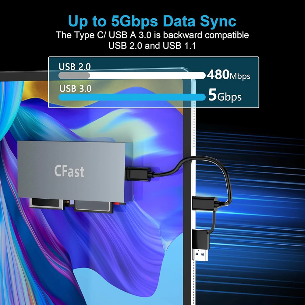 1. Velocidad CFast 2,0:Experimente una rápida transferencia de datos con nuestro lector de tarjetas CFast 2,0, que cuenta con una interfaz USB 3,0 de alta velocidad capaz de transferir hasta 5Gbps. Mueve rápida y eficazmente imágenes de alta resolución y grabaciones de vídeo a tu ordenador, con compatibilidad con versiones anteriores para USB 2,0 y USB 1,1.