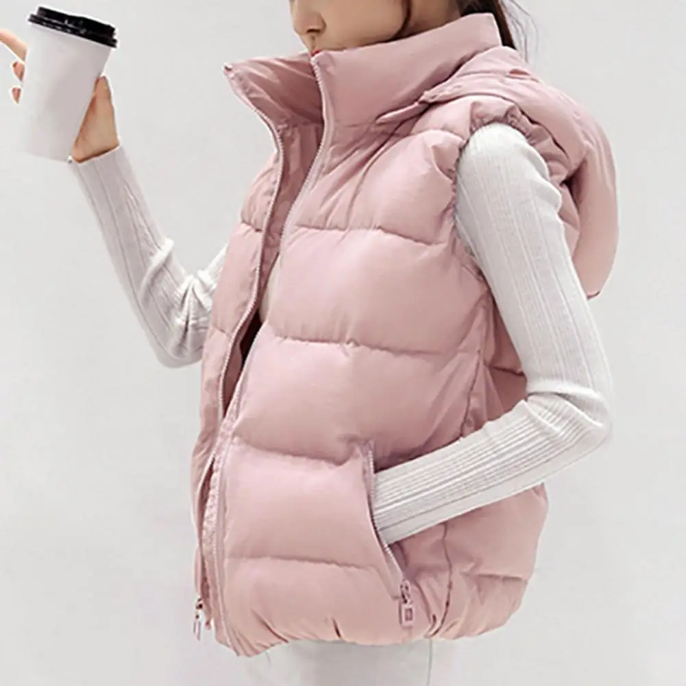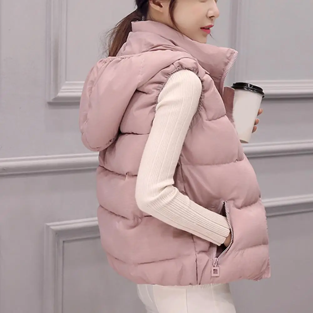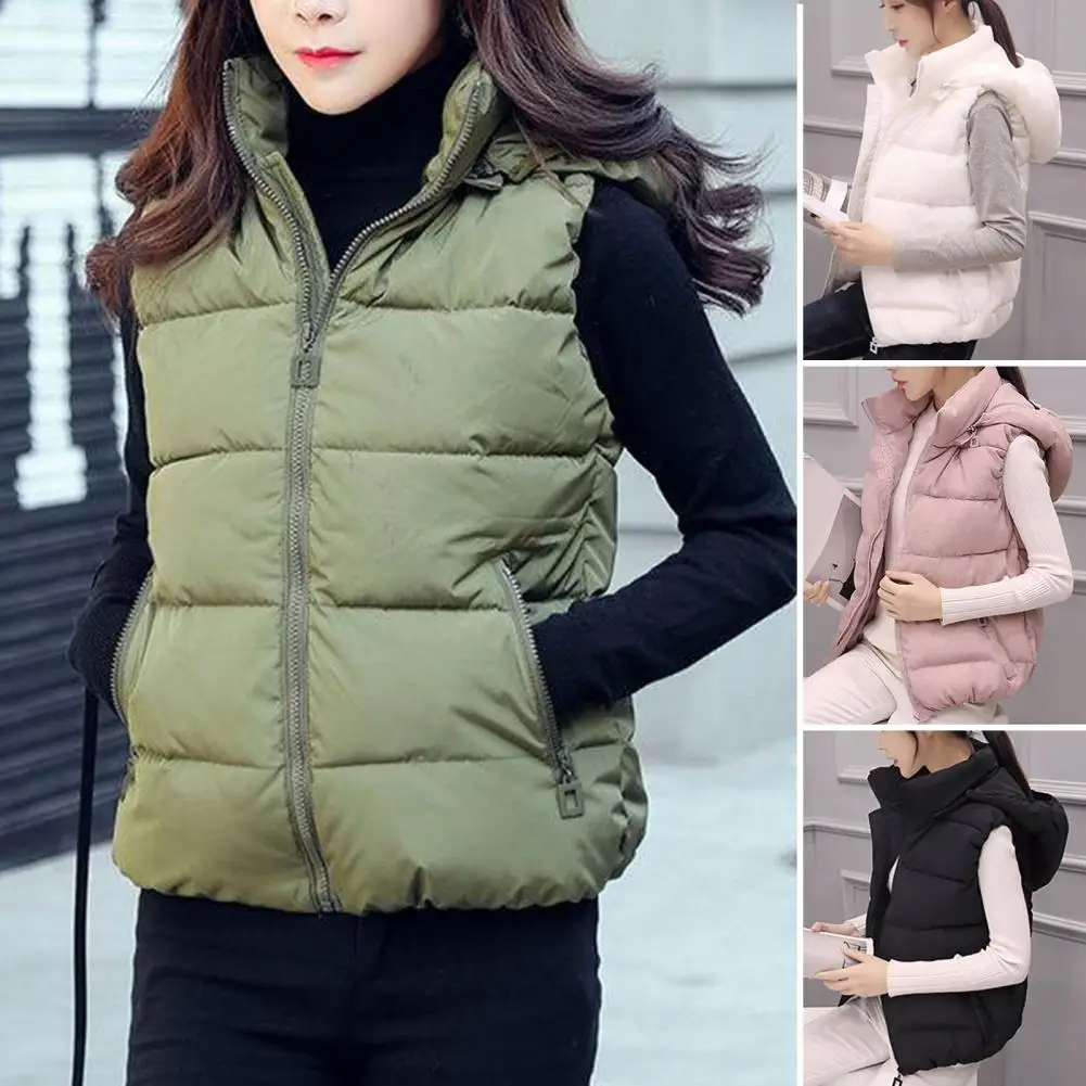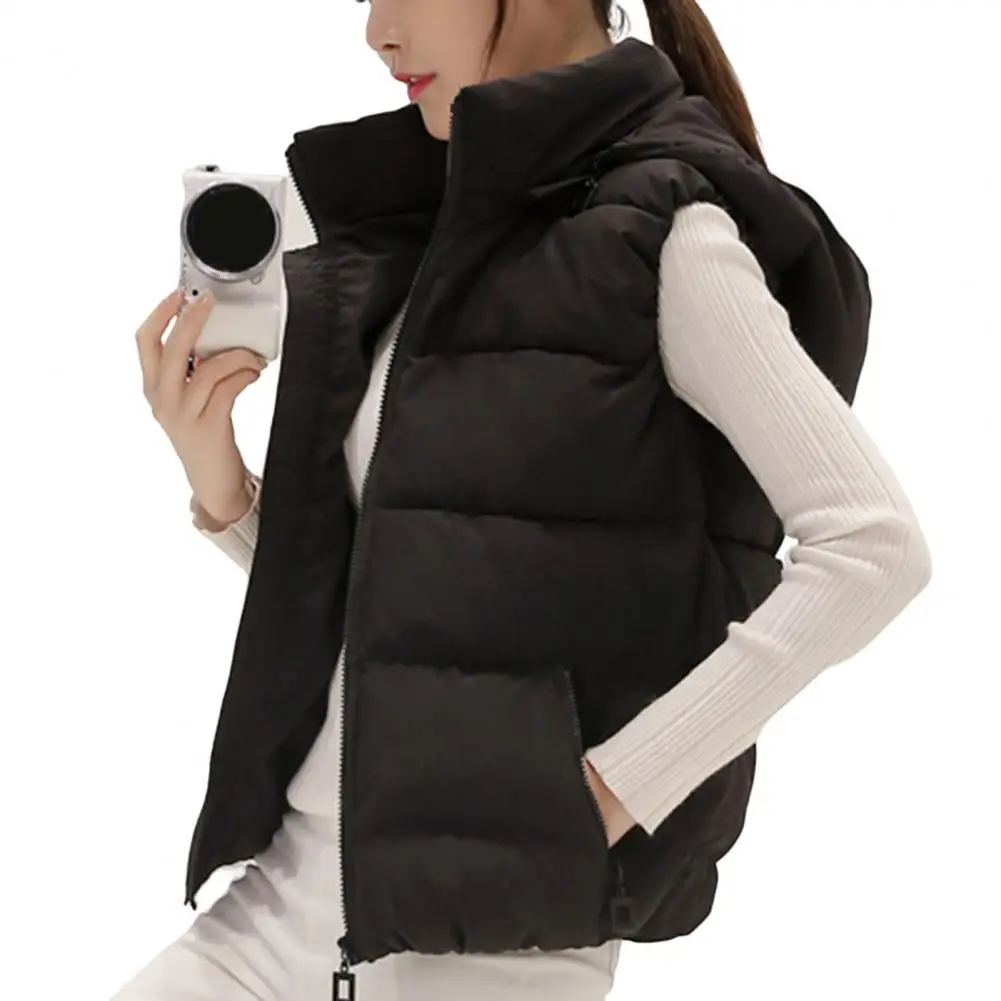 Estilo: Moda Género: Mujeres Tipo de talla: talla grande Temporada: otoño, invierno Tipo de cuello: cuello alto Longitud de La Manga: sin mangas Longitud del chaleco: Regular Tipo de tapeta: cierre de cremallera Características: color sólido, bolsillos inclinados, sombrero extraíble