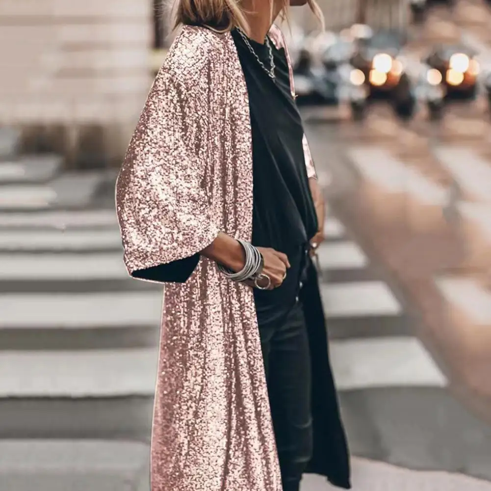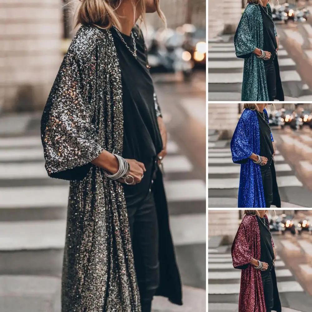 Comprar Chaqueta de capa de moda, cárdigan suave sin botones, abrigo de longitud media con purpurina, prendas de vestir exteriores sueltas, ropa de vestir