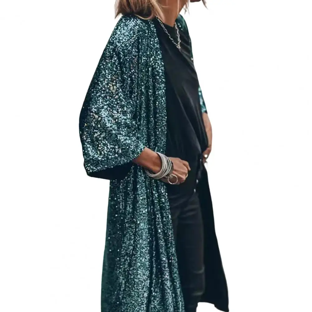 Con este cárdigan largo de punto abierto, es conveniente ponérselo y quitárselo. El cárdigan simple tiene lentejuelas brillantes, lo que te hace más elegante.