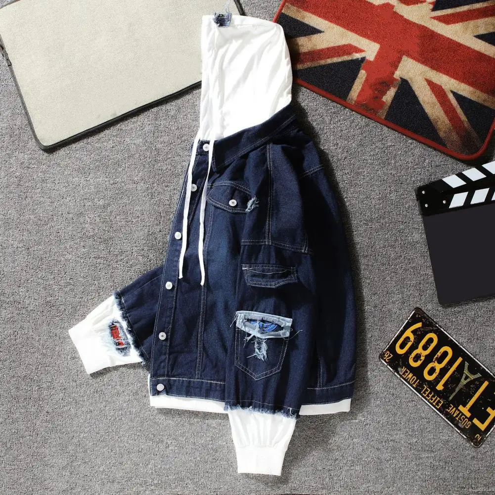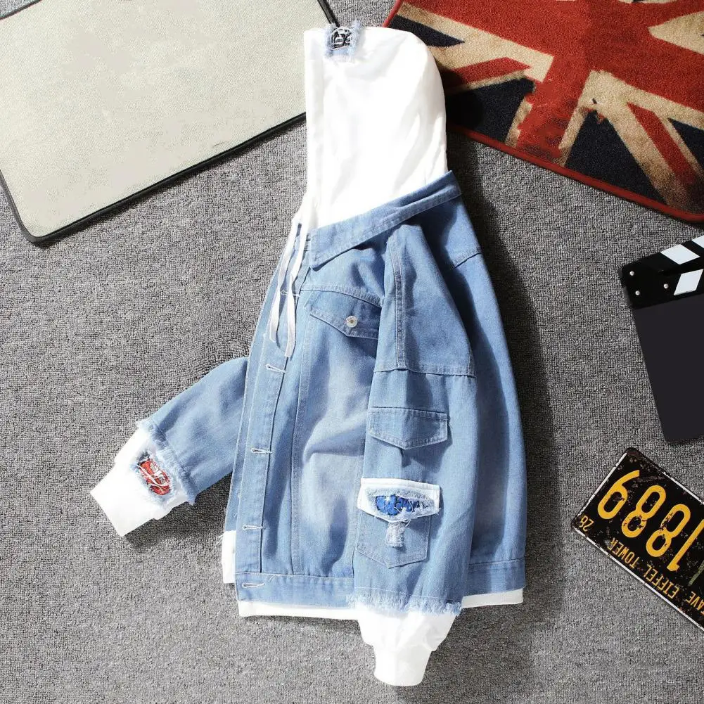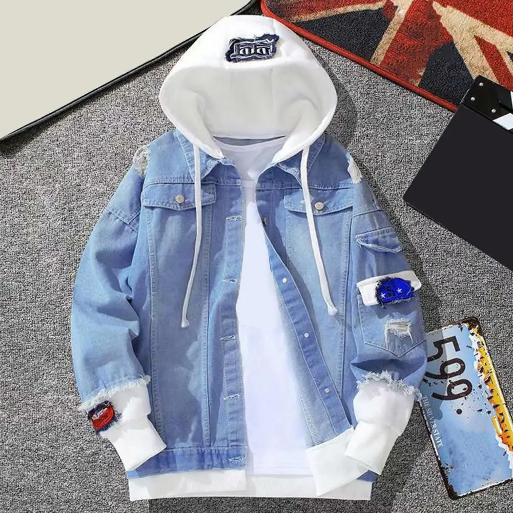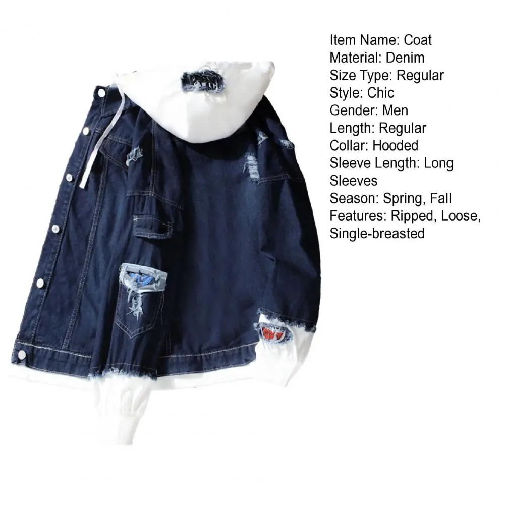 Chaqueta de mezclilla de otoño Abrigo de primavera con capucha para hombre con diseño de un solo pecho a juego de colores Bolsillo de parche rasgado Casual para hombres