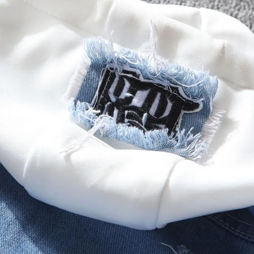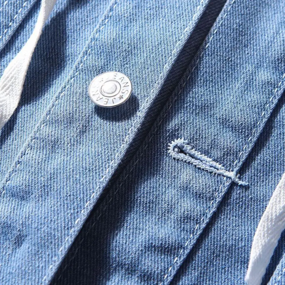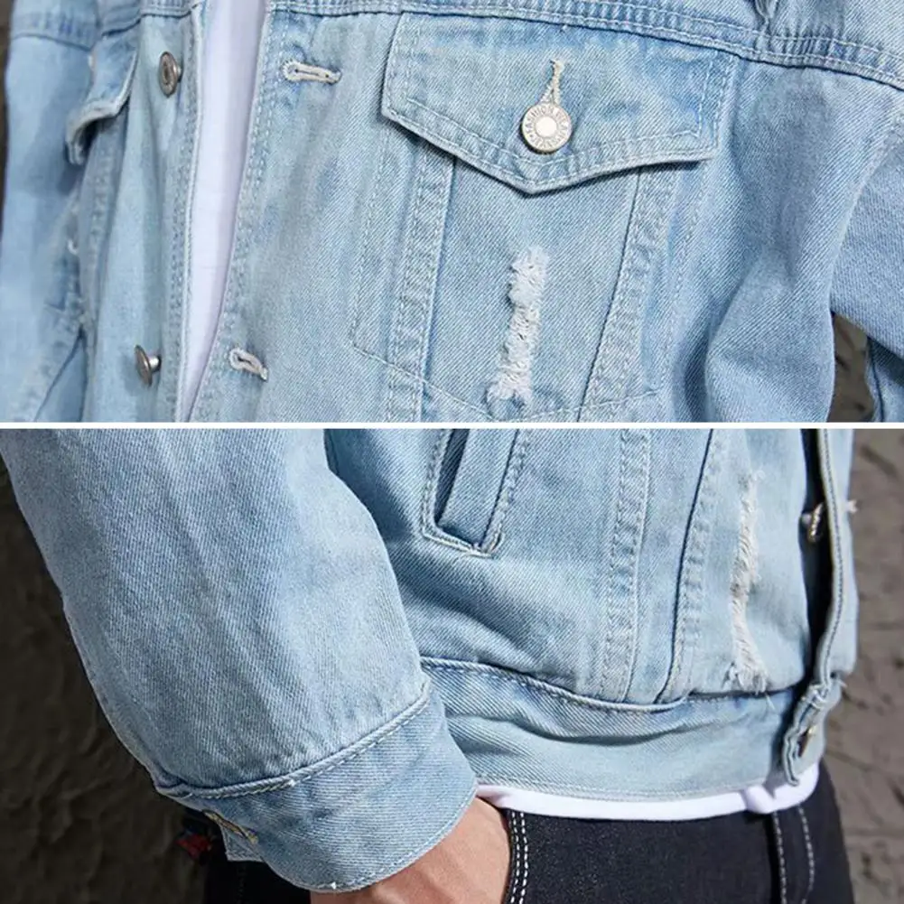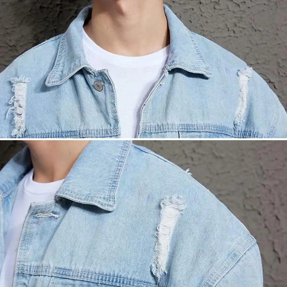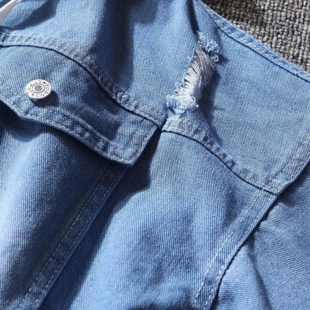Chaqueta de mezclilla de otoño Abrigo de primavera con capucha para hombre con diseño de un solo pecho a juego de colores Bolsillo de parche rasgado Casual para hombres