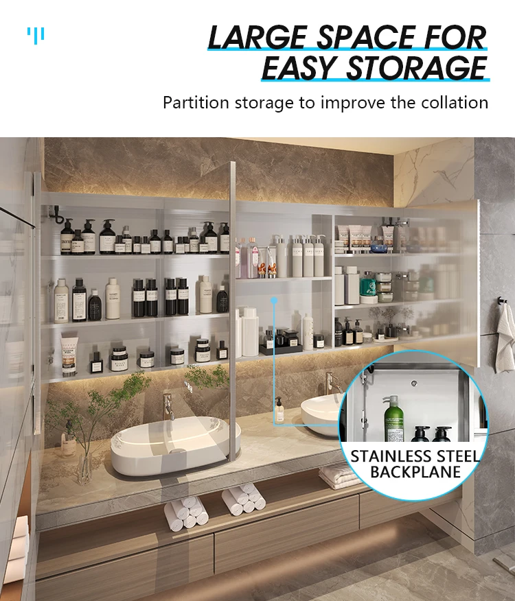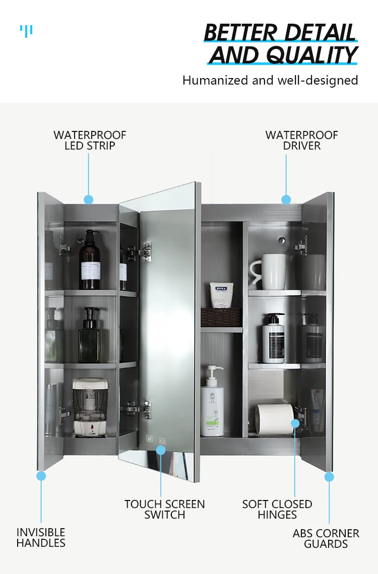 G.W/CTN (kg) 48 Material 1) Espejo: espejo de cristal plateado de 5 mm 2) carcasa: 304#acero inoxidable 3) tornillos, bisagras, cajones, son completamente de acero inoxidable. Acabado pulido Paquete Embalaje estándar de exportación: bolsa de polietileno + espuma protectora + tablero de espuma ploy + caja de cartón + marco de madera (si es necesario) MOQ 20 piezas Lugar de origen Foshan Guangdong China. Certificación CTS, SAA, GS, TUV, CE, EMC. Característica Respetuoso del medio ambiente Toma de afeitadora disponible Cliente OEM Bienvenido Logotipo del cliente Podría ofrecerse mediante impresión láser. Tiempo de entrega 15-20 días después de recibir su depósito del 30%. Pago T/T, HSBC, LC, Western union, MoneyGram, Paypal, están disponibles para nosotros.