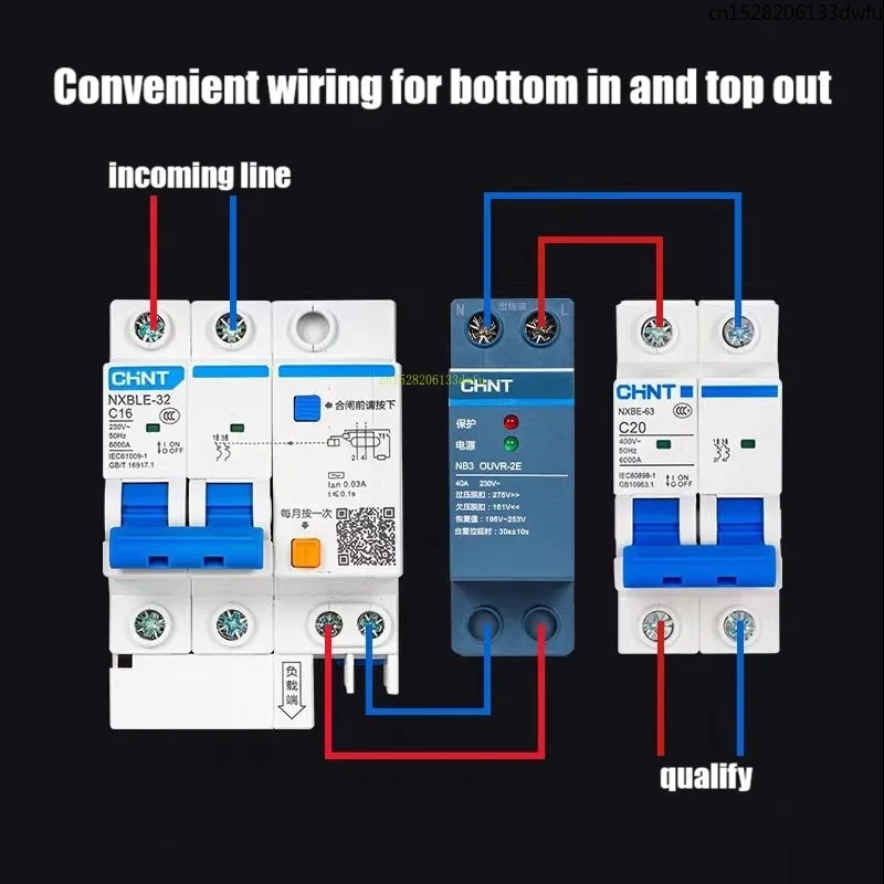 CHINT NB3 OUVR-2E Protector de sobretensión y bajo voltaje tipo autorecuperación 1P + N con entrada inferior y disyuntor de salida superior