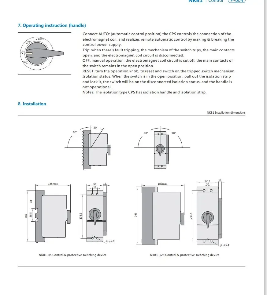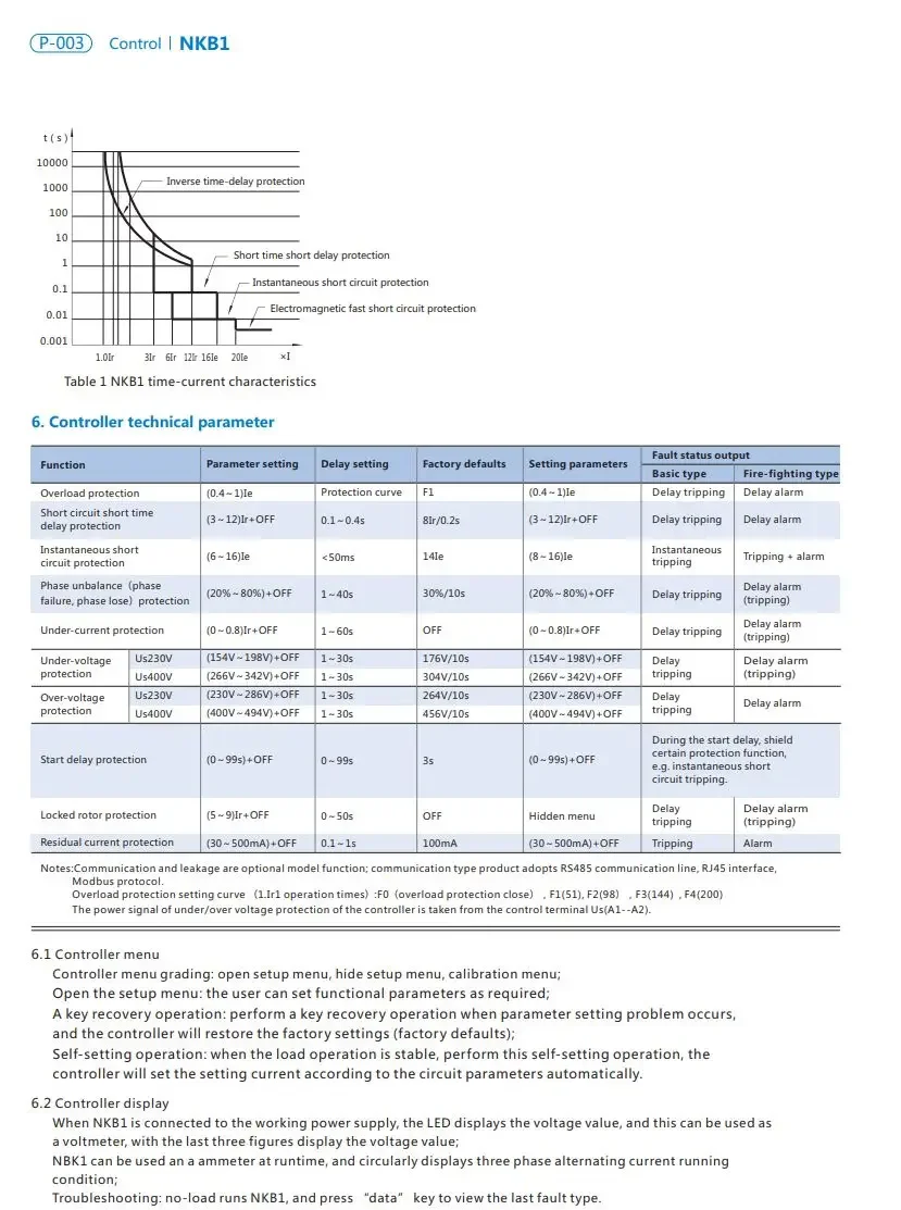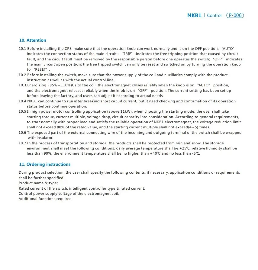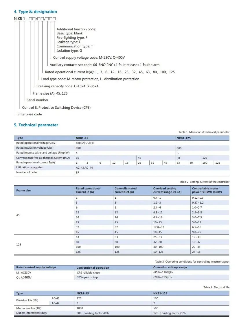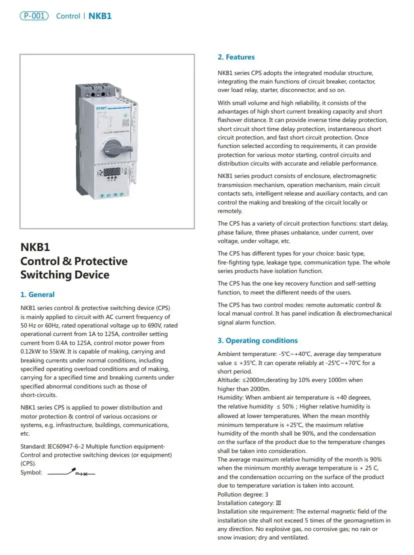 El dispositivo de conmutación de protección y control de la serie NKB1 (CPS) se aplica principalmente a circuitos con una frecuencia de corriente CA de 50 Hz o 60 Hz, voltaje operativo nominal de hasta 690 V, corriente operativa nominal de 1 A a 125 A, corriente de configuración del controlador de 0.4A a 125A, controla la potencia del motor desde 0.12kW a 55kW.Es capaz de fabricar, transportar y romper corrientes en condiciones normales, incluidas las específicas de sobrecarga de funcionamiento y de fabricación, transportar por un tiempo específico y romper corrientes en condiciones anormales específicas como las de cortocircuitos.