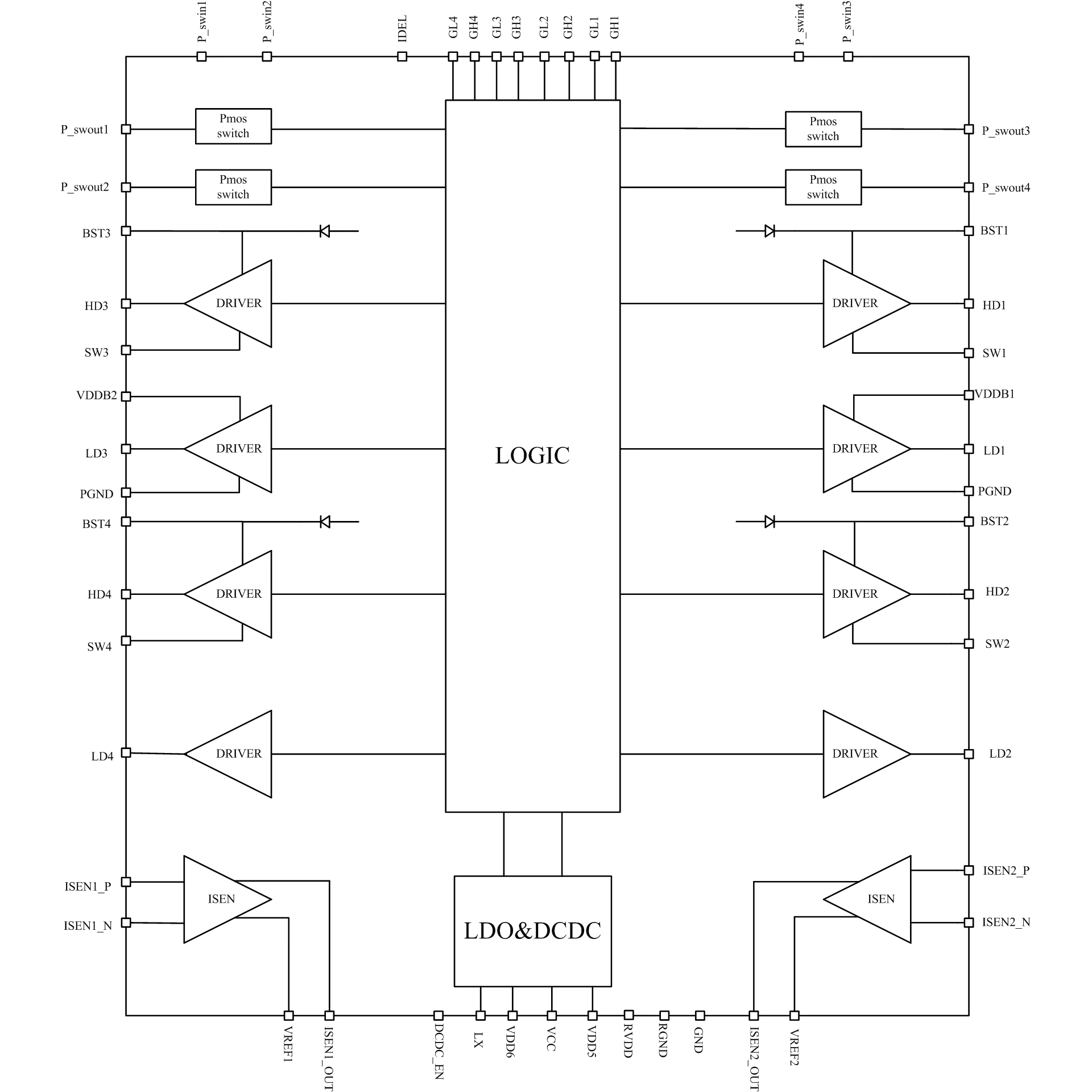 DCDC y LDO están integrados dentro del chip, y el voltaje de salida es de 6V y 5V respectivamente. 6V se utiliza para alimentar la parte del controlador, lo que puede proporcionar una mayor eficiencia. 5V puede proporcionar energía a la MCU. El chip también integra cuatro fuentes de corriente constante independientes para controlar el interruptor PMOS de carga.