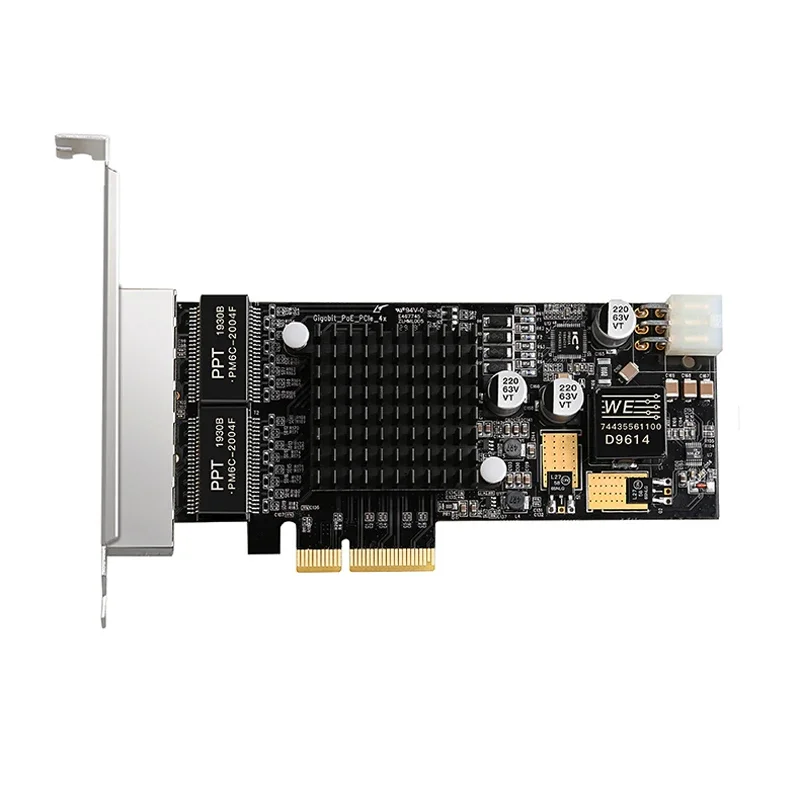 Este es un adaptador de servidor PCI Express Gigabit 802.3at PoE+ de 4 puertos con un máximo de hasta 70 vatios de salida de energía a través de cables Ethernet.Cumple con el estándar PCI-E, se puede instalar en cualquier placa base de servidor o IPC con conector PCI-E para que el IPC o servidor pueda comunicar otros dispositivos Ethernet y suministrar energía a dispositivos PD.