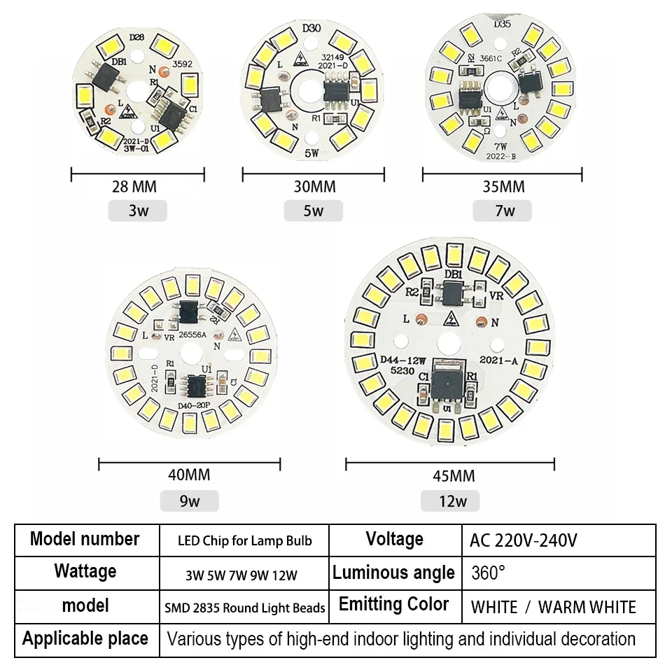Chip LED para bombilla 3W 5W 7W 9W 12W SMD 2835 cuentas de luz redondas AC 220V-240V bombilla Chip iluminación foco 90 lúmenes/W