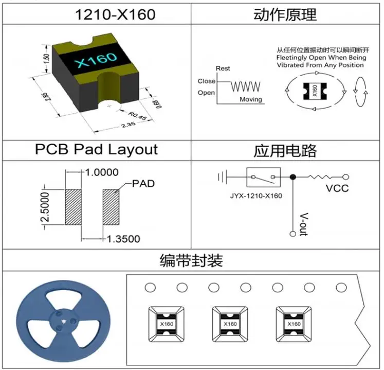 Chip X160 SMD con Sensor de vibración, interruptor sensible de contacto de una sola bola, 50 piezas/2 piezas, 1210 JYX-1210-X160
