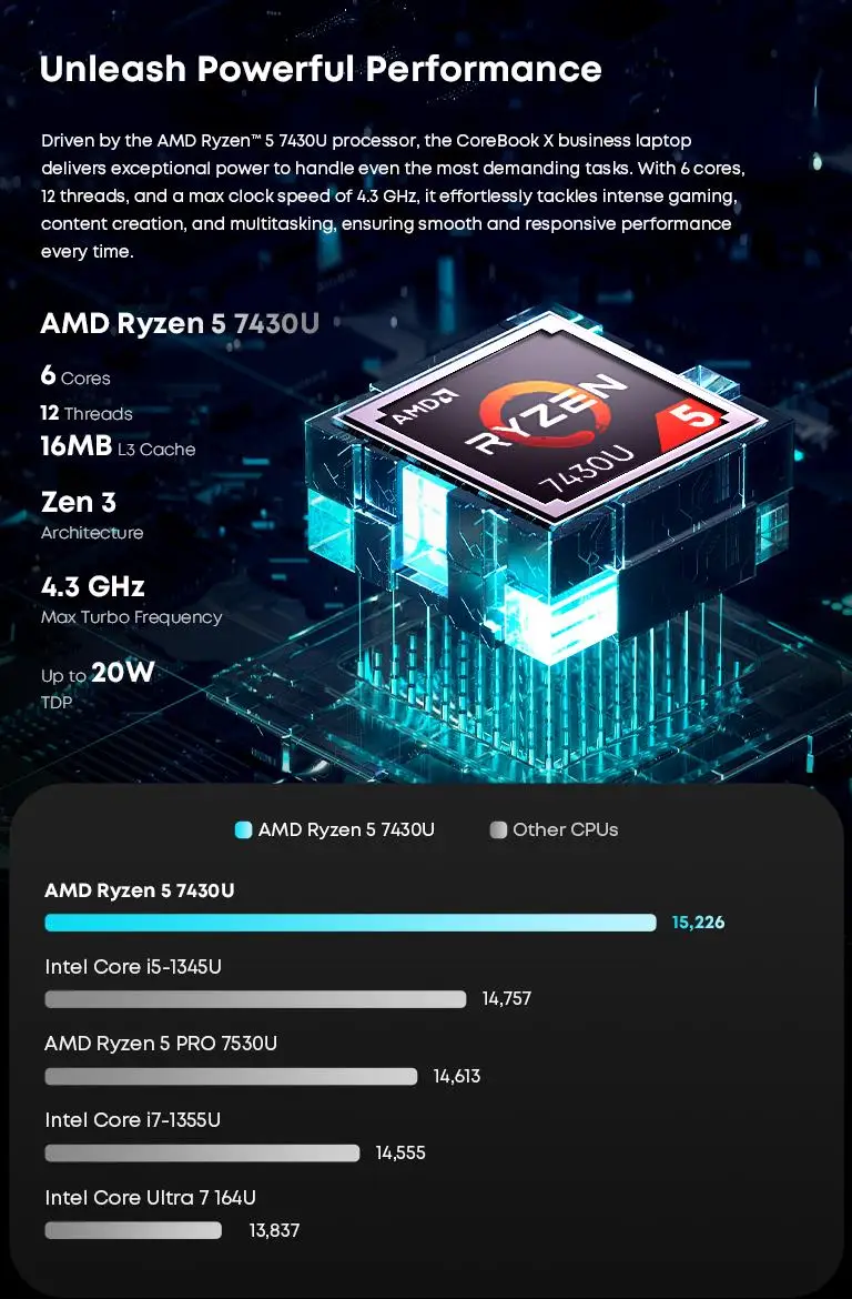 Impulsada por el procesador AMD Ryzen" 5 7430U, la computadora portátil empresarial CoreBook X ofrece una potencia excepcional para manejar incluso las tareas más exigentes.Con 6 núcleos, 12 hilos y una velocidad máxima de reloj de 4,3 GHz, aborda sin esfuerzo juegos intensos, creación de contenidos y multitarea, lo que garantiza un rendimiento fluido y receptivo en todo momento.