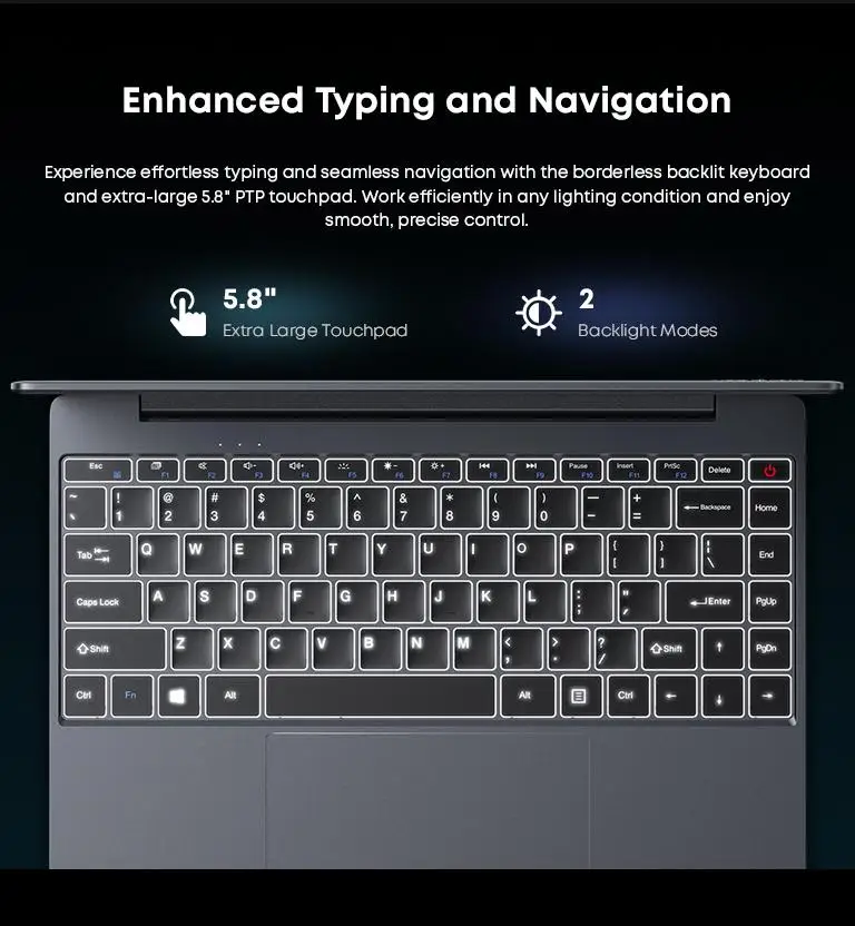 Experimente una escritura sin esfuerzo y una navegación fluida con el teclado retroiluminado sin bordes y el panel táctil PTP extra grande de 5,8".Trabaje de manera eficiente en cualquier condición de iluminación y disfrute de un control suave y preciso.