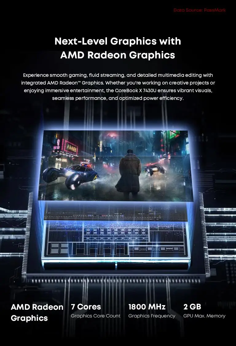 Experimente juegos fluidos, transmisión fluida y edición multimedia detallada con gráficos AMD Radeon" integrados.Ya sea que esté trabajando en proyectos creativos o disfrutando de entretenimiento inmersivo, el CoreBook X 7430U garantiza imágenes vibrantes, un rendimiento perfecto y una eficiencia energética optimizada.