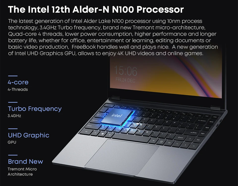 La Última Generación del procesador lntel Alder Lake N100 con tecnología de proceso de 10nm, frecuencia Turbo de 3,4 GHz, nuevo Tremont de 4 hilos, menor consumo de energía, mayor rendimiento y mayor duración de la batería, ya sea para la oficina, entretenimiento o aprendizaje, edición de documentos o producción de video básica, FreeBook funciona bien y funciona bien. Una nueva generación de lntel UHD Graphics GPU, permite disfrutar de vídeos 4K UHD y juegos en línea.