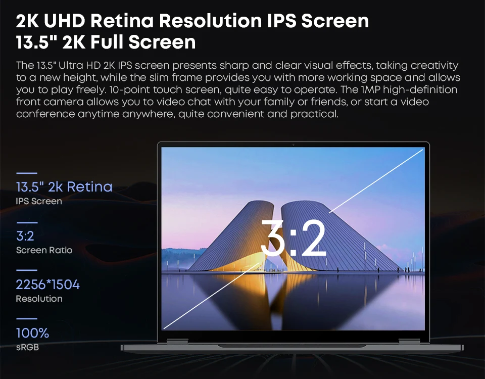La Pantalla de 13,5 "Ultra HD 2K IPS presenta efectos visuales nítidos y claros, llevando la creatividad a una nueva altura, mientras que el marco Delgado le proporciona más espacio de trabajo y le permite jugar libremente. Pantalla táctil de 10 puntos, bastante fácil de operar. La cámara frontal de alta definición de 1MP le permite chatear por vídeo con su familia o amigos, o iniciar una videoconferencia en cualquier momento y en cualquier lugar, muy conveniente y práctica.