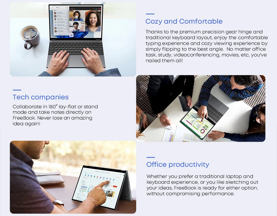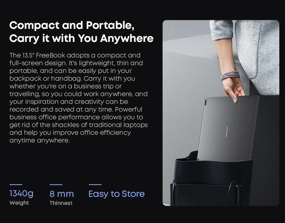 El FreeBook de 13,5 "Adopta un diseño compacto y de pantalla completa. Es ligero, delgado y portátil, y se puede poner fácilmente en su mochila o bolso. Llévelo con usted tanto si está en un viaje de negocios como de viaje, para que pueda trabajar en cualquier lugar, y su inspiración y creatividad pueden grabarse y guardarse en cualquier momento. El Potente rendimiento de la oficina de negocios le permite deshacerse de los grilletes de los portátiles tradicionales y le ayuda a mejorar la eficiencia de la oficina en cualquier momento y en cualquier lugar.