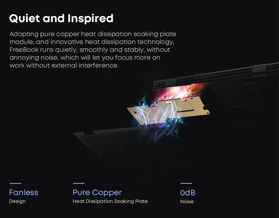 Adoptando un módulo de placa de remojo de disipación de calor de cobre puro y una tecnología innovadora de disipación de calor, FreeBook funciona de forma silenciosa, suave y estable, sin ruidos molestos, lo que le permitirá concentrarse más en el trabajo sin interferencias externas.