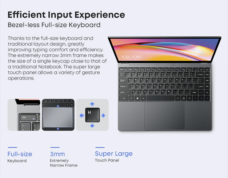 Gracias al teclado de tamaño completo y al diseño tradicional, mejora enormemente la comodidad y la eficiencia de la escritura. El marco extremadamente estrecho de 3mm hace que el tamaño de una sola tecla sea similar al de un portátil tradicional. El panel táctil supergrande permite una variedad de operaciones de gestos.