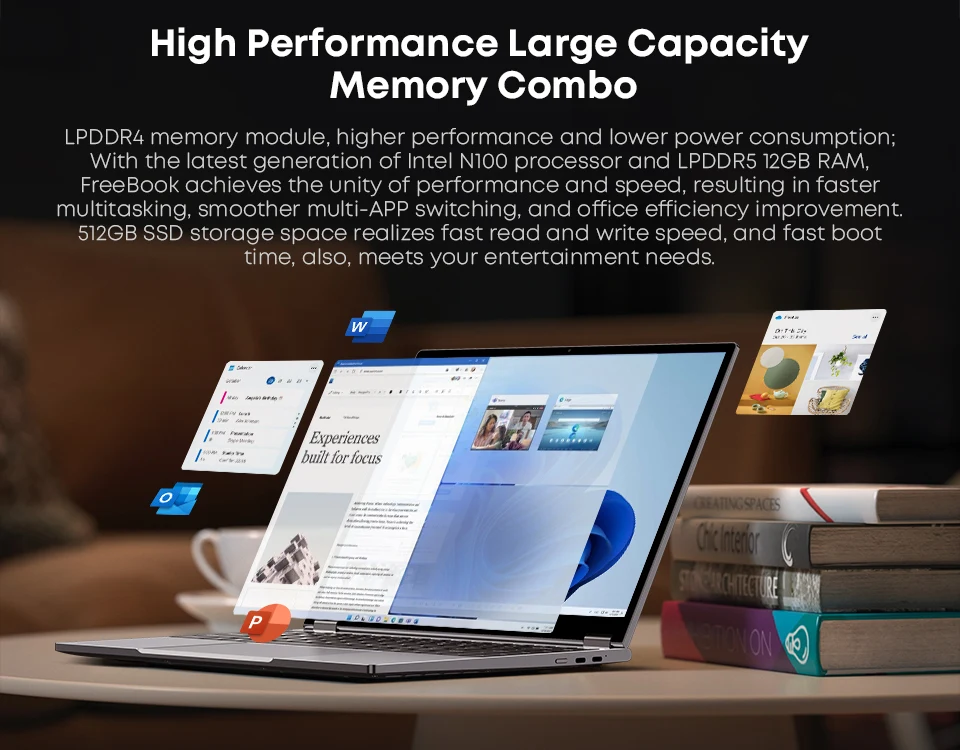 Módulo de memoria LPDDR4, mayor rendimiento y menor consumo de energía: con la última generación de procesador Intel N100 y LPDDR5 12B RAM.FreeBook logra la unidad de rendimiento y velocidad, lo que resulta en una multitarea más rápida, un cambio de multiaplicación más fluido y una mejora de la eficiencia de la Oficina. El espacio de almacenamiento SSD de 512GB permite una velocidad de lectura y escritura rápida y un tiempo de arranque rápido. También satisface sus necesidades de entretenimiento.