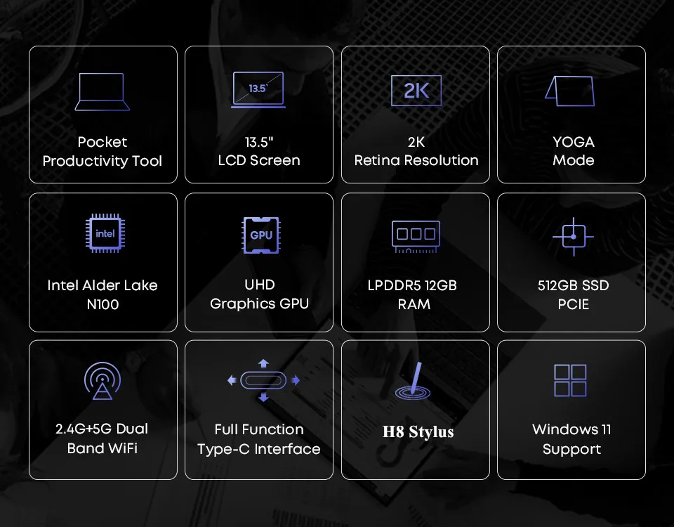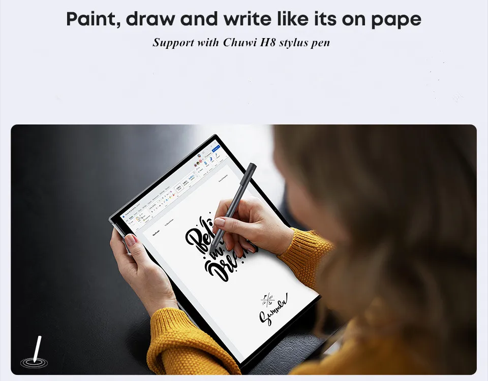 La pantalla IPS Ultra HD 2K de 13,5" presenta efectos visuales nítidos y claros, llevando la creatividad a una nueva altura, mientras que el marco delgado le brinda más espacio de trabajo y le permite jugar libremente.Pantalla táctil de 10 puntos, bastante fácil de operar.La cámara frontal de alto definición de 1MP le permite chatear por video con su familia o amigos, o iniciar una videoconferencia en cualquier momento y lugar, muy conveniente y práctico.