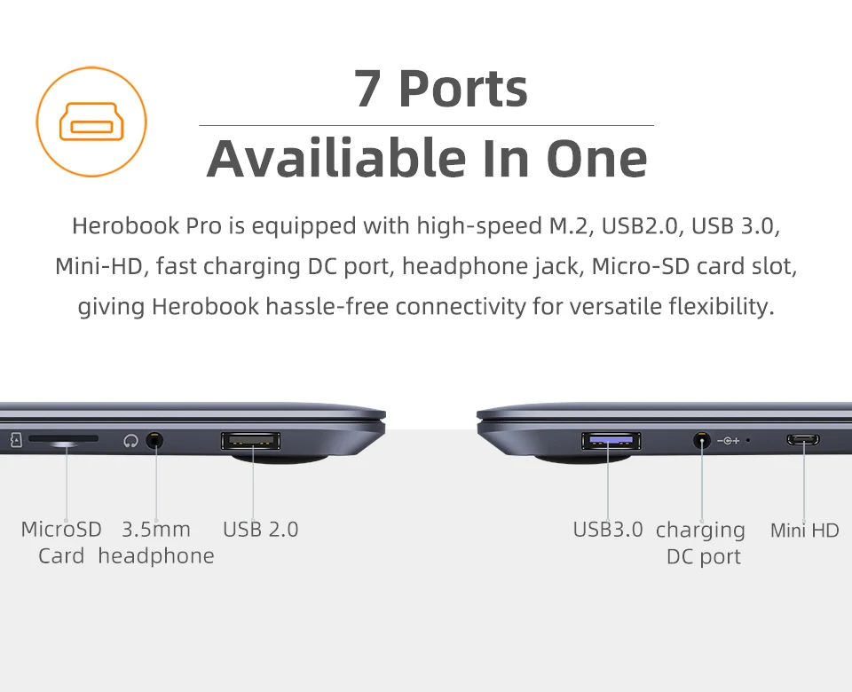 CHUWI HeroBook Pro lo inspirará a ser más productivo en el trabajo, la escuela o el entretenimiento. Es ligero y elegante, con una hermosa pantalla IPS 14,1x1920 de 1080 pulgadas, 2,4G WiFi/5G para una conexión rápida, y fiabilidad con la que puede contar dondequiera que inicie su negocio. Este dispositivo infinito es rápido y la batería tiene suficiente capacidad para ayudarte durante el día.