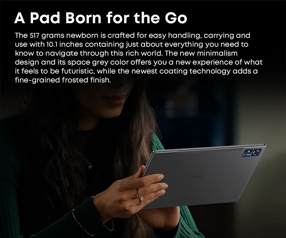 El recién nacido de 517 gramos está diseñado para un fácil manejo, transporte y uso con 10,1 pulgadas que contiene casi todo lo que necesita saber para navegar por este rico mundo. El nuevo diseño minimalista y su color gris espacial le ofrece una nueva experiencia de lo que se siente ser futurista, mientras que la tecnología de recubrimiento más nueva agrega un acabado escarchado de grano fino.