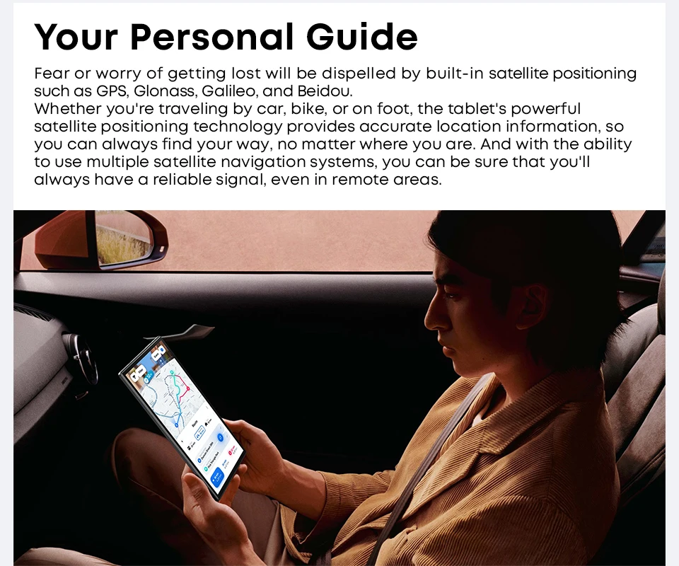 El miedo o la preocupación de perderse se disipará mediante el posicionamiento satelital incorporado como GPS, Glonass, Galileo y Beidou.
