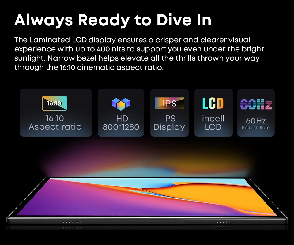 La pantalla LCD laminada garantiza una experiencia visual más nítida y clara con hasta 400 NITs para apoyarle incluso bajo la luz solar brillante. El bisel estrecho ayuda a elevar todas las emociones lanzadas a través de la relación de aspecto cinematográfico de 16:10.