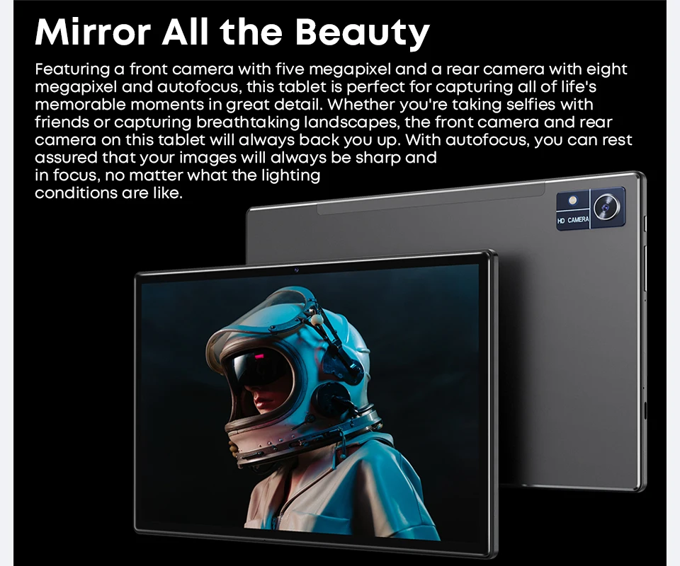 Con una cámara frontal con cinco megapíxeles y una cámara trasera con ocho megapíxeles y autoenfoque, esta tableta es perfecta para capturar todos los momentos memorables de la vida con gran detalle. Ya sea que vuelva a tomar selfies con amigos o capture paisajes impresionantes, la cámara frontal y la cámara trasera de esta tableta siempre lo respaldarán. Con el enfoque automático, puede estar seguro de que sus imágenes siempre estarán afiladas y enfocadas, sin importar las condiciones de iluminación.