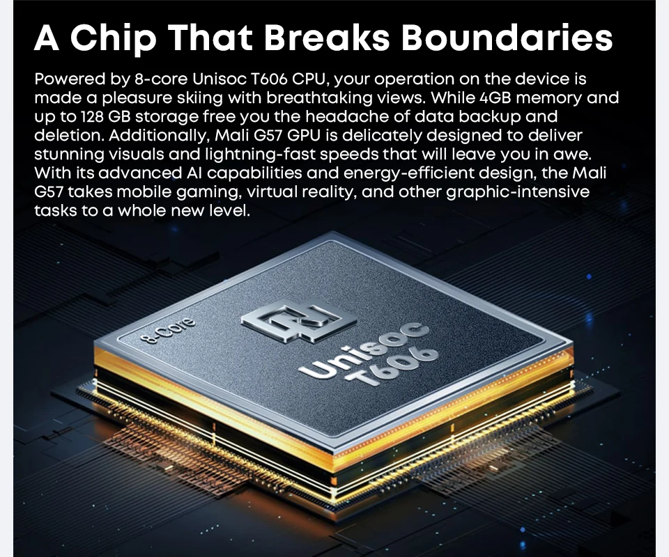 Alimentado por una CPU Unisoc T606 de 8 núcleos, su operación en el dispositivo se convierte en un placer esquiar con vistas impresionantes. Mientras que la memoria de 4GB y hasta 128 GB de almacenamiento te liberan del dolor de cabeza de la copia de seguridad y eliminación de datos.