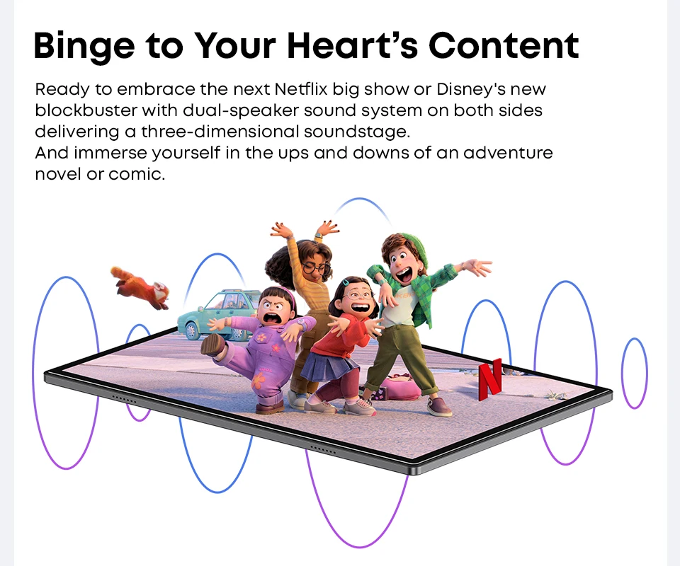 Listo para abrazar el próximo gran espectáculo de Netflix o el nuevo éxito de taquilla de Disney con sistema de sonido de doble altavoz en ambos lados que ofrece un escenario sonoro tridimensional. Y sumérgete en los altibajos de una aventura