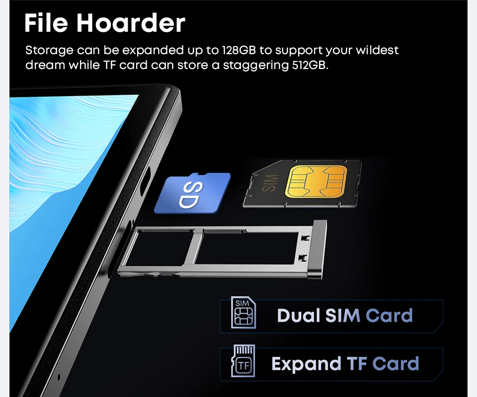 El almacenamiento se puede ampliar hasta 128GB para apoyar tu sueño más salvaje mientras que la tarjeta TF puede almacenar asombrosos 512GB