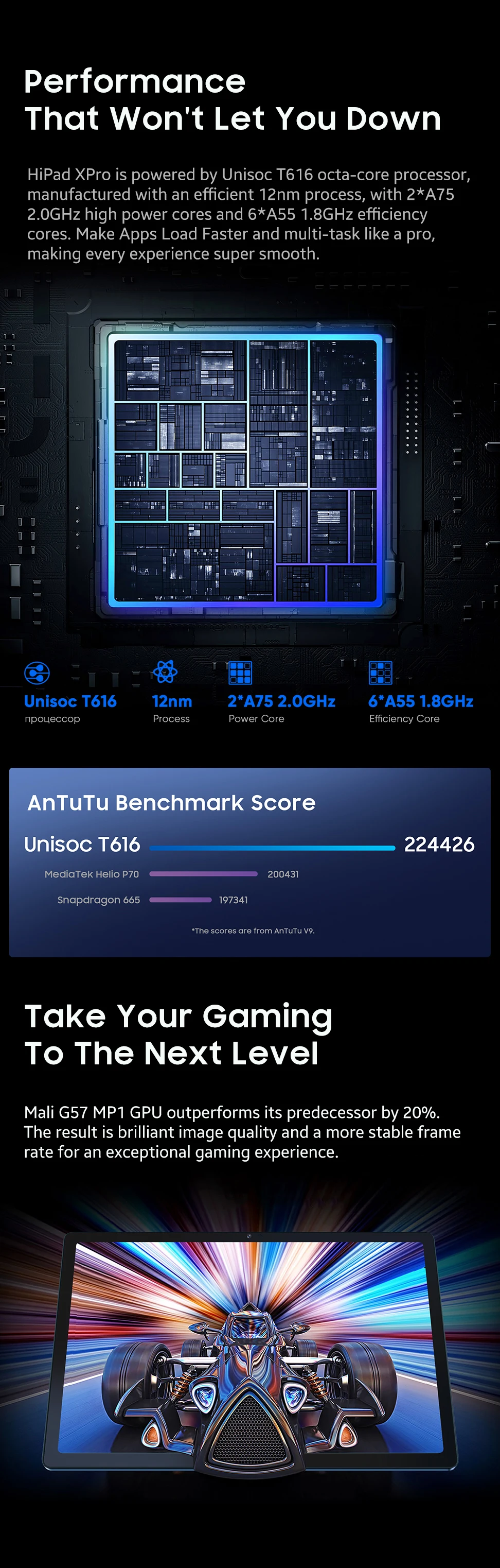 El procesador Octa-Core Unisoc T616 A75*2 2,0 Ghz + A55*6 de 1,8 Hz proporciona un funcionamiento mucho más suave y garantiza una experiencia de juego fluida.