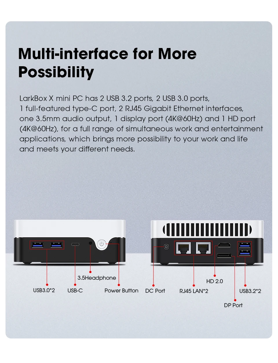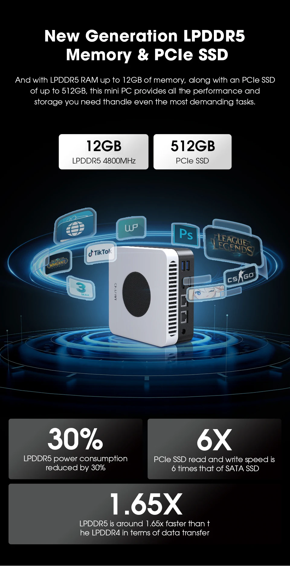 -Características de LarkBox X Mini PC 12GBDe RAM LPDDR5, más SSD de 512GB, puede reemplazar SSD de 512GB a 1TBAlmacenamiento a través de 2280 M.2 ranuras.
