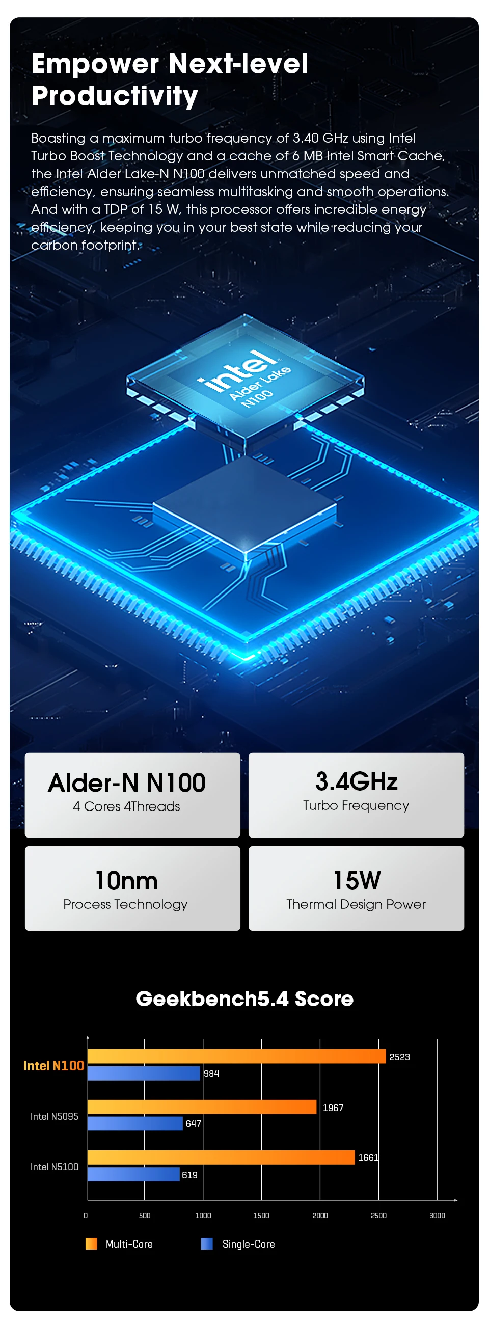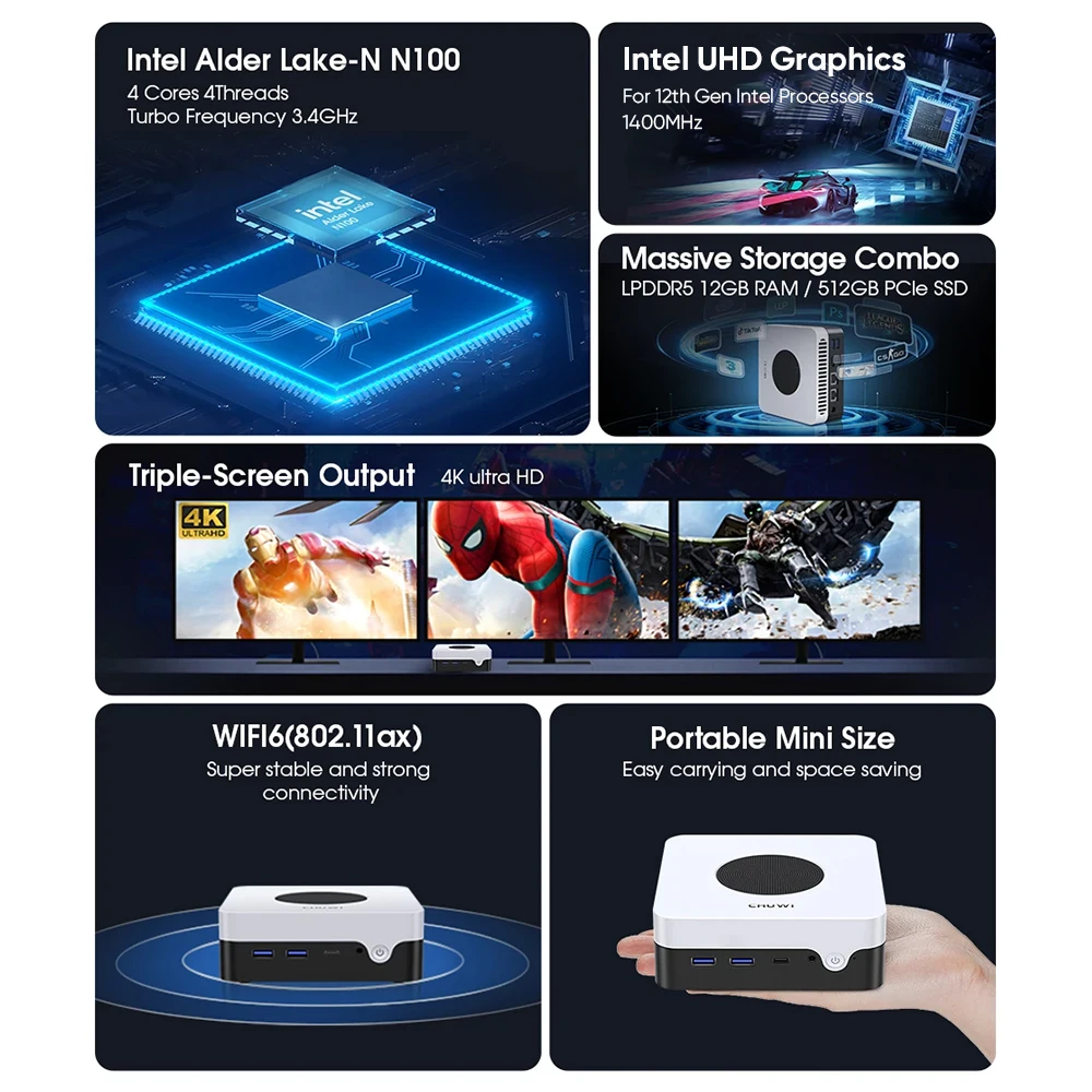 -En comparación con otros mini pc, el Intel N100Mayor TDP y mejor rendimiento bajo largos períodos de carga. I Gráficos ntel UHD para procesadores Intel de 12ª generación, Frecuencia principal de 0,8 GHz y frecuencia turbo de 3,4 GHz.