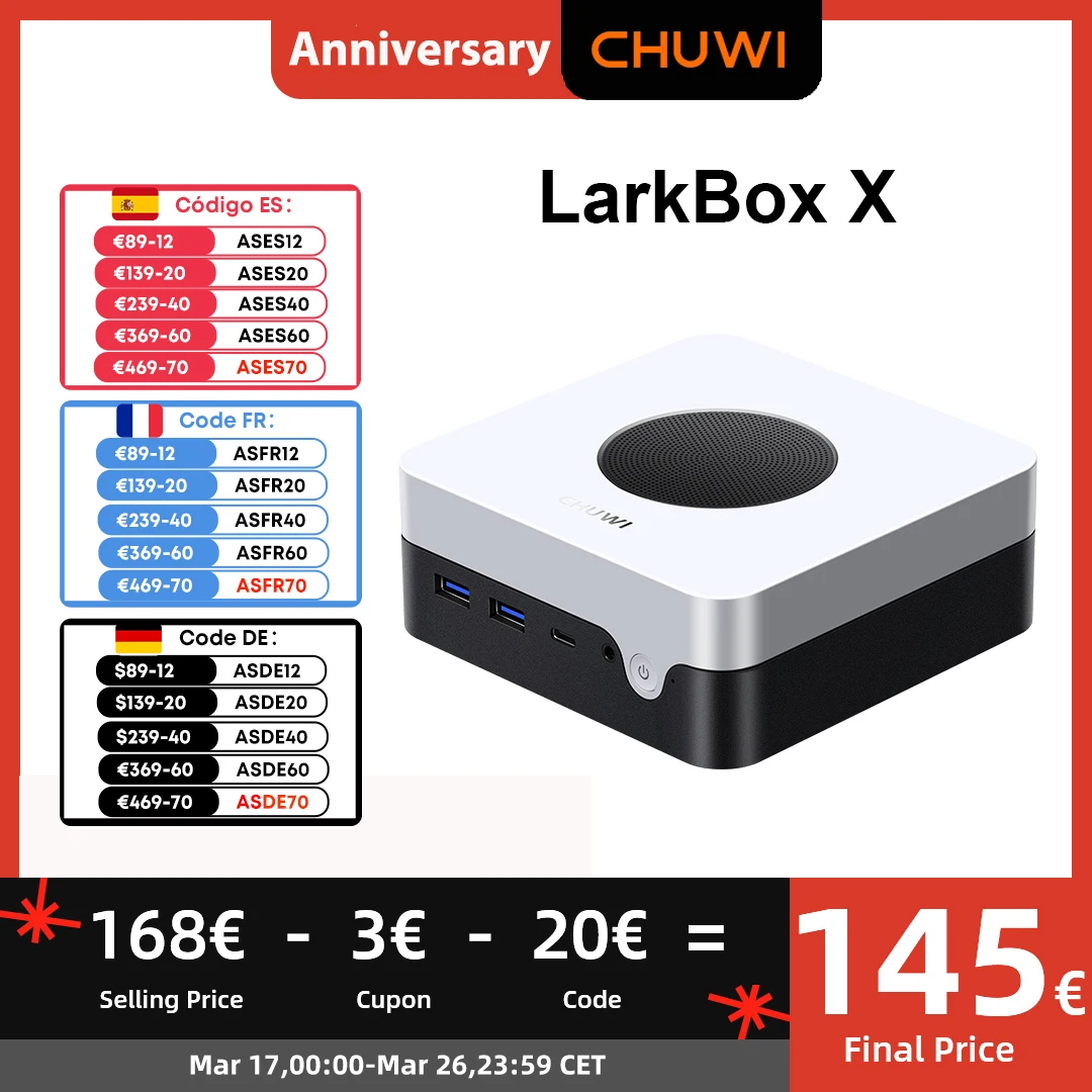 Contenido del paquete1 * Mini PC1 * Cargador/cable DC (19V/3.42A)1 * Manual de usuario1 * Tarjeta de garantíaComprar CHUWI LarkBox X Mini PC Gaming Intel 12th N100 15W 12GB LPDDR5 512GB SSD Windows 11 WiFi 6 BT 5.2 Almacenamiento extendido Hasta 1TB